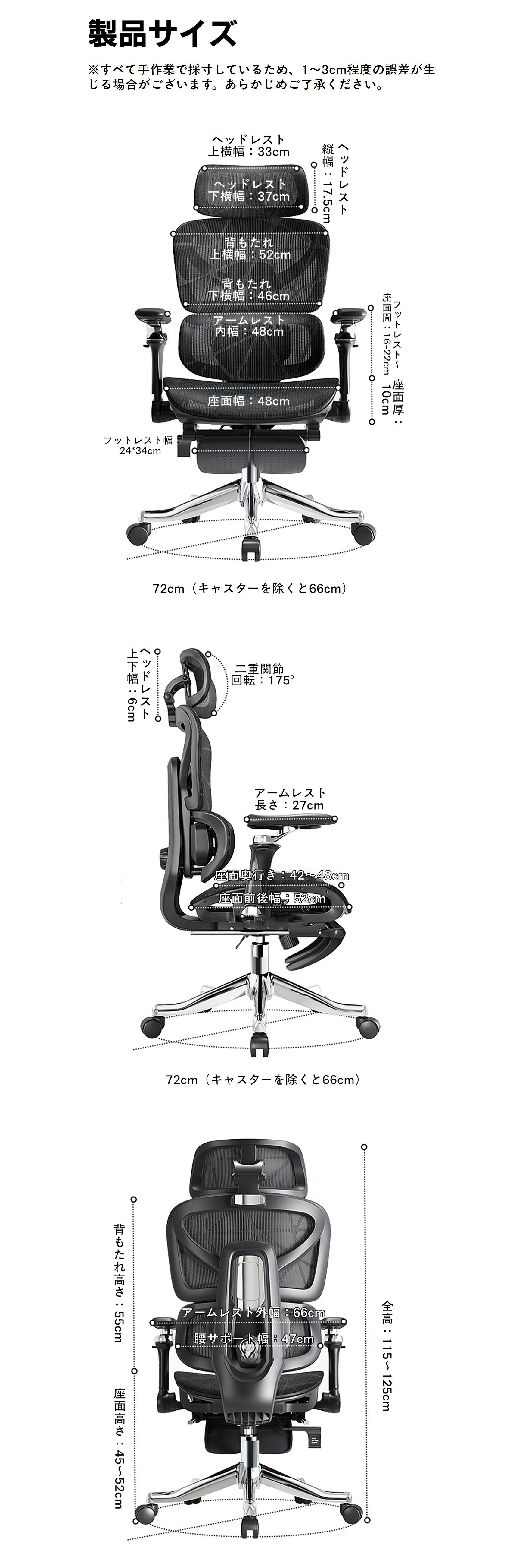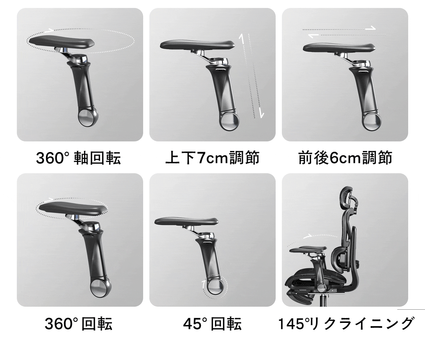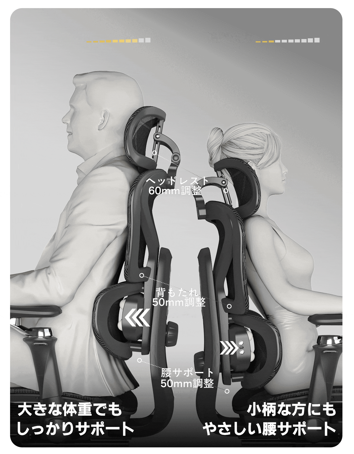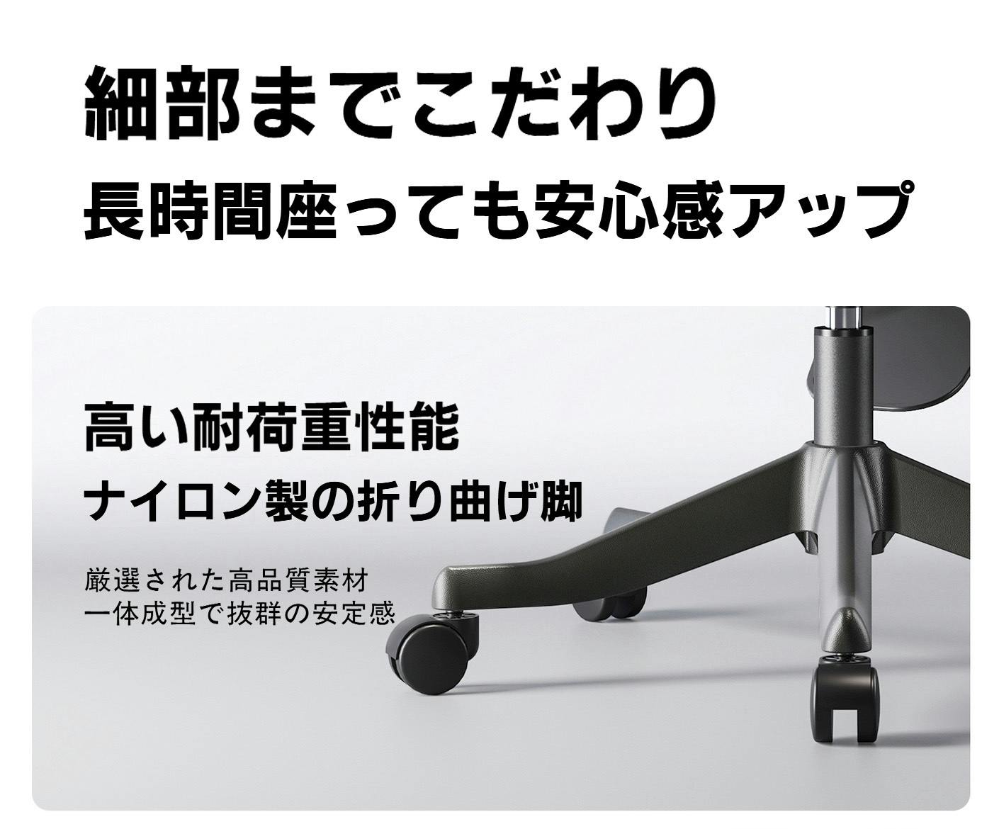 三段階で調整可能な腰サポートにより、姿勢に合わせてフィット感を調整できます。無重力のような軽やかな座り心地で、長時間座っても快適に過ごせます。