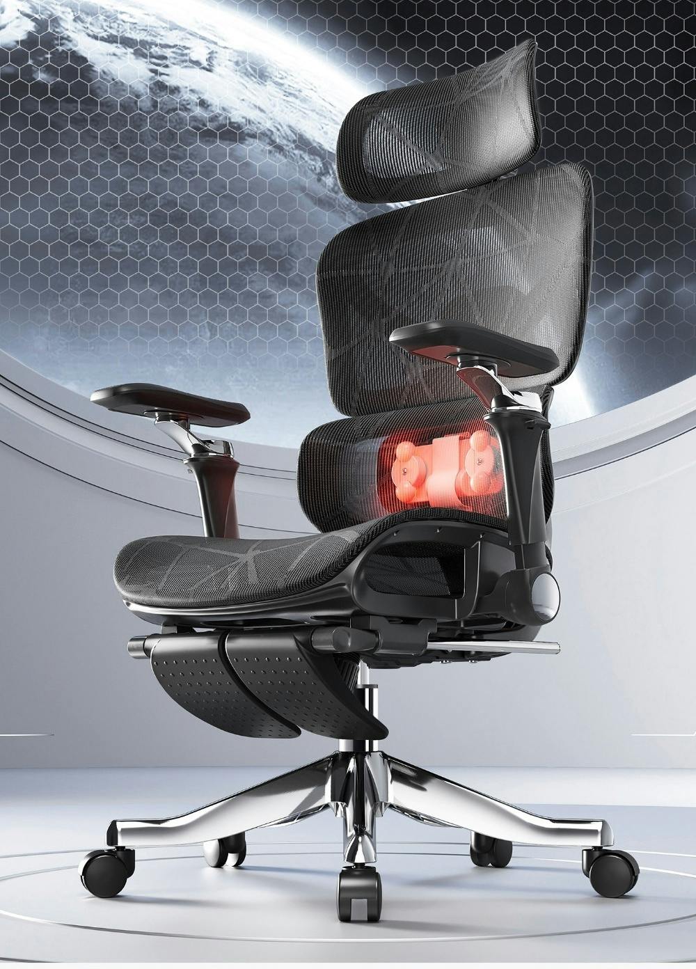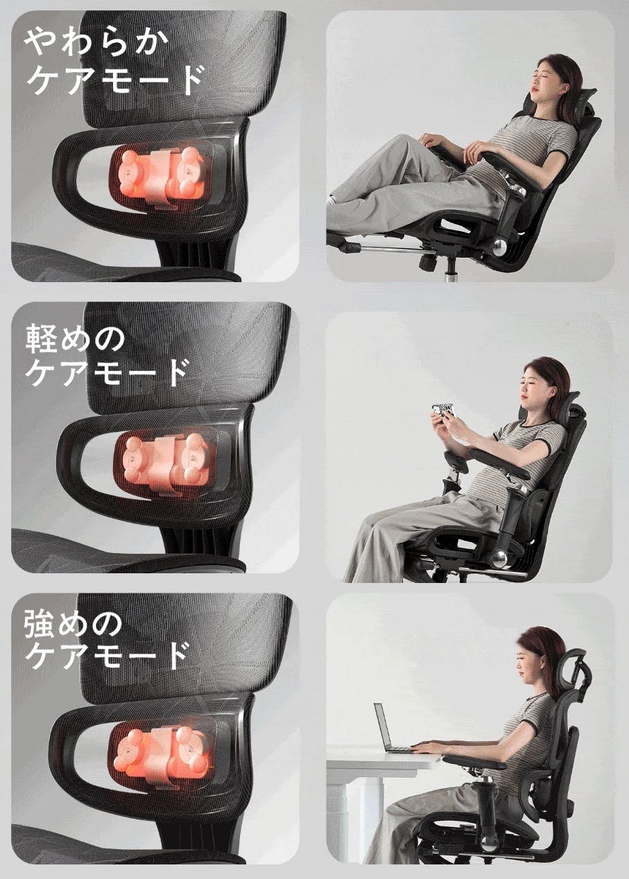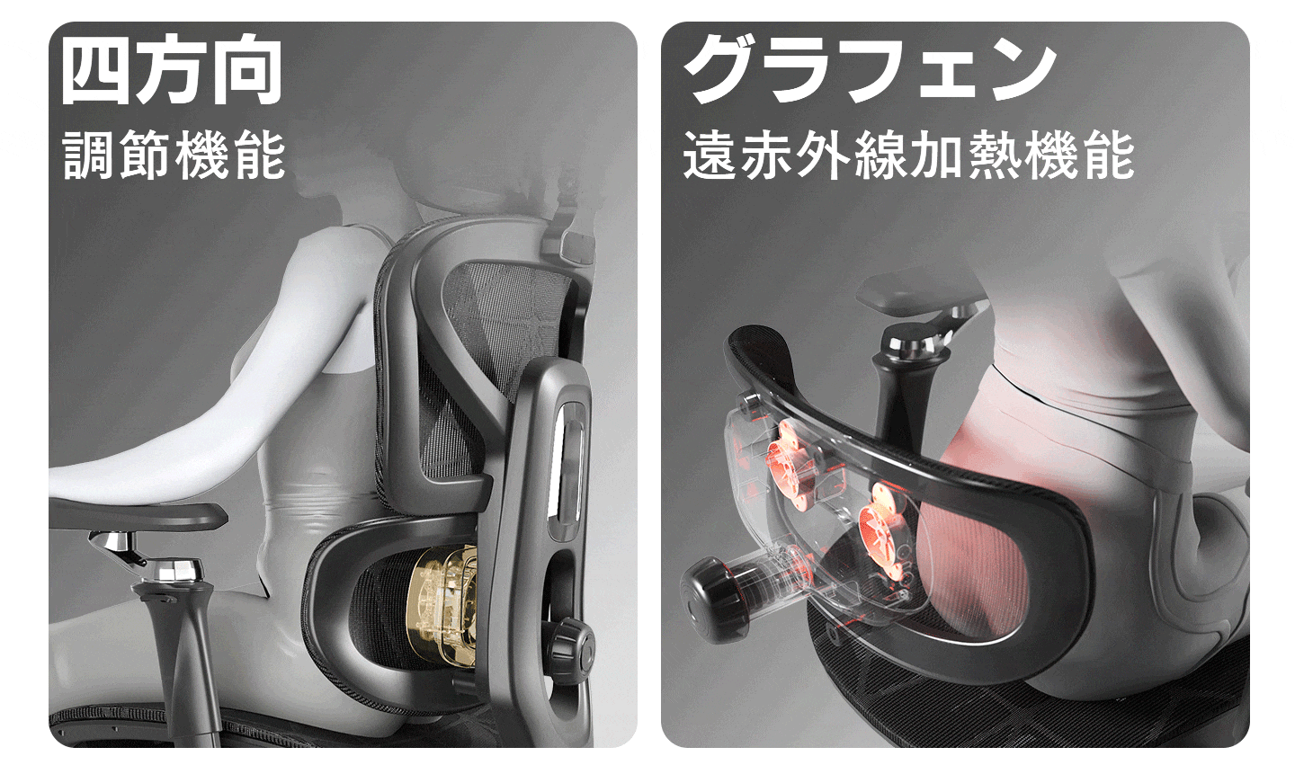 「グラフェン遠赤外線ヒート×振動で腰と背中ケア」など多機能設計で背筋を自然に伸ばし、長時間のデスクワークも快適。