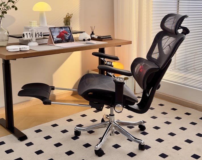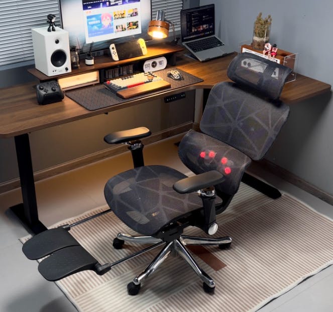 最大145°まで自在に角度調整できるリクライニング機能を備え、デスク環境に合わせて快適な姿勢をキープ。隠し式フットレストを引き出せば、足を伸ばしてゆったりとリラックスできます。