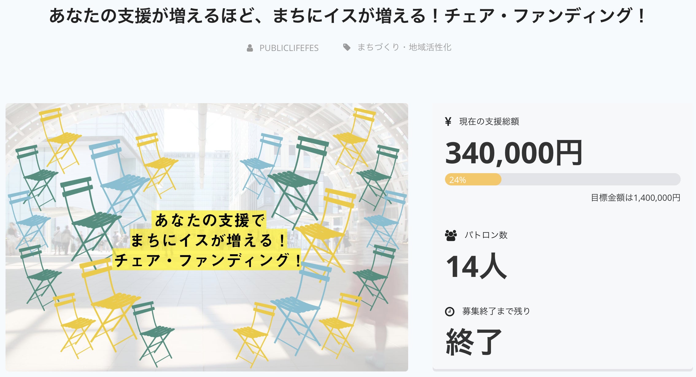 2018/09/23 14:52この度は、 「あなたの支援が増えるほど、まちにイスが増える!チェア・ファンディング!」 にご支援いただき、誠にありがとうございました! お陰様で、 支援総額:340000円 達成率:24% パトロン:14人 と、たくさんの方に、ご支援いただきました。 どうもありがとうございます! 引き続き、「パブリックライフ フェスさいたま新都心2018」のプロセスなども、 活動報告や、SNSでもご報告していきます。 https://twitter.com/publiclifefeshttps://www.facebook.com/publiclifefes.shintoshin/https://www.instagram.com/publiclifefes/ また、以下の2つのプロジェクトも引き続き、募集中です! ぜひ、パブリックライフフェスさいたま新都心2018を成功させるためにも、ご支援や拡散のご協力をよろしくお願いいたします。 【9/29締切】 未来の日常をつくる!「さいたま新都心」を使い倒すパブリックライフフェスを実現! https://camp-fire.jp/projects/view/89544 もっと見る【お礼】ご支援いただき、ありがとうございました!(支援者限定)活動報告#18