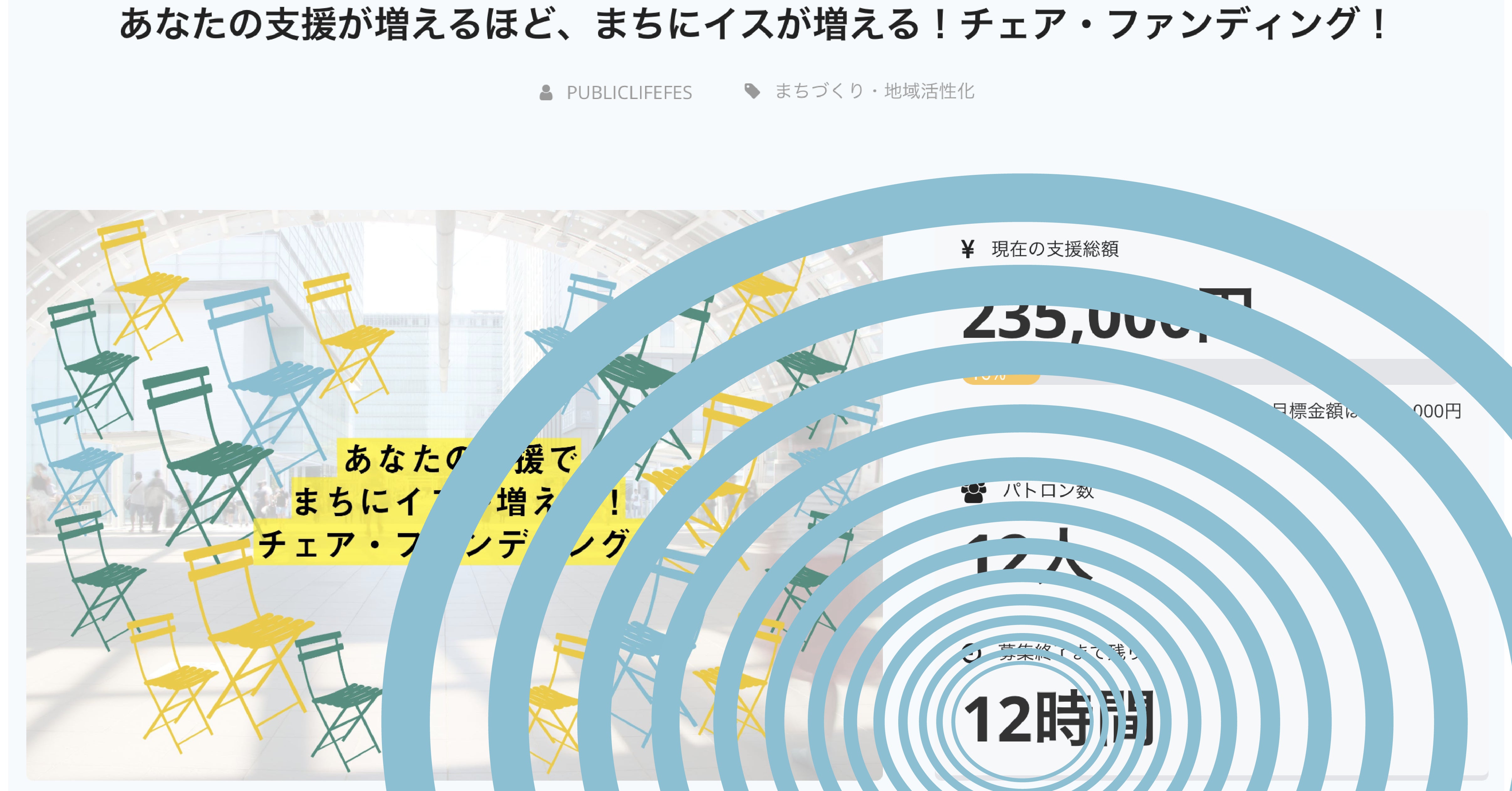 この度は、 「あなたの支援が増えるほど、まちにイスが増える!チェア・ファンディング!」 にご支援いただき、誠にありがとうございました! お陰様で、 支援総額:340000円 達成率:24% パトロン:14人 と、たくさんの方に、ご支援いただきました。 どうもありがとうございます! 引き続き、「パブリックライフ フェスさいたま新都心2018」のプロセスなども、 活動報告や、SNSでもご報告していきます。 https://twitter.com/publiclifefeshttps://www.facebook.com/publiclifefes.shintoshin/https://www.instagram.com/publiclifefes/ また、以下の2つのプロジェクトも引き続き、募集中です! ぜひ、パブリックライフフェスさいたま新都心2018を成功させるためにも、ご支援や拡散のご協力をよろしくお願いいたします。 【9/29締切】 未来の日常をつくる!「さいたま新都心」を使い倒すパブリックライフフェスを実現! https://camp-fire.jp/projects/view/89544