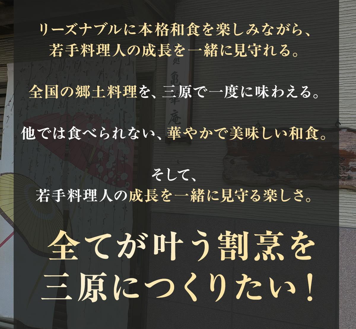 この度、割烹「味処亀華庵」の移転プロジェクトを立ち上げました