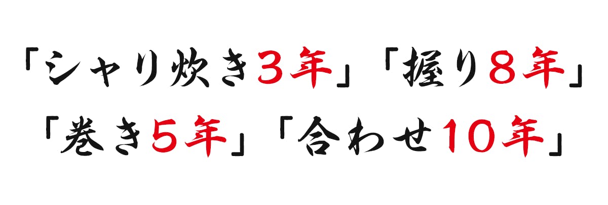 ご存知の方もいるかと思いますが、和食の世界には「シャリ炊き3年」「握り8年」「巻き5年」「合わせ10年」という言葉があります。