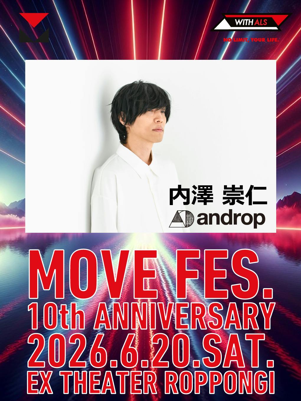 皆さんこんにちは!WITH ALSの武藤 将胤です。いつも応援ありがとうございます。MOVE FES.2026クラウドファンディングがSTARTして8日目となりました!現在、目標金額の29%達成、137名の方にご支援頂いています!8日目で29%を達成し、本当に嬉しく思います!皆様のあたたかなご支援、そして一つ一つのコメントを大切に拝見しています。心より感謝申し上げます。引き続きご支援・拡散のご協力、どうぞよろしくお願いいたします!それでは、さっそく第2回目の活動報告をお届けいたします。MOVE FES.2026にご賛同出演いただく皆様からの応援メッセージのご紹介です。本日は、andropの内澤崇仁さんです。内澤さんとは、2018-2019のINNOVATION WORLD FESTA.での共演がきっかけでずっと仲良くさせてもらっており、これまで『REASON OF BIRTH』『UNREAL』『FLY』『EVERYONE,CHALLENGER.』などの数々コラボレーション曲を共に発表してきました!そんな内澤崇仁さんが、MOVE FES.2026に賛同アーティストとして参加いただく想いを寄せていただきました!内澤崇仁さん、あたたかな応援メッセージを本当にありがとうございます!応援メッセージ武藤さんの活動や生き方から、いつもたくさんの勇気と希望をもらっています。MOVE FES. は、人の心を動かし、希望を灯す特別なフェスだと思います。ひとりでも多くの方がこの素晴らしい時間に出会えるよう、支援の輪がさらに大きく広がっていくことを願っています。心から応援しています。フェス当日は一緒に最高の時間にしましょう!androp 内澤崇仁プロフィール【内澤崇仁 Profile】 4人組バンド『androp』のVocal&Guitar。2009年12月、1stアルバム『anew』でデビュー。メジャーデビューから3年で国立代々木競技場第一体育館で1万人を動員する単独公演を開催。数々の映画やドラマ主題歌、CMソングを手がけるなど楽曲の注目度は高く、ミュージック・ビデオもカンヌ国際広告祭(フランス)、One Show(アメリカ)、Webby Awards(アメリカ)ほか国内外11のアワードで受賞するなど、その映像世界やアートワークでも世界的な評価を得ている。バンド活動以外にも、蜷川実花の個展音楽や、新田真剣佑と北村匠海のW主演映画『サヨナラまでの30分』の音楽プロデューサーを務める。また、映画『君は月夜に光り輝く』や、ビートたけしの初恋愛小説を原作とする映画『アナログ』(二宮和也、波瑠共演)の劇中音楽を担当し、オリジナル・サウンドトラックをリリース。2025年にはTBS系ドラマ『DOPE/麻薬取締部特捜課』(高橋海人・中村倫也W主演)で、連続ドラマの劇伴音楽を初担当。柴咲コウ、南波志帆、坂本真綾、Aimer、miwa、上白石萌音、Da-iCE、宮川愛李、有華、幾田りら、菊池桃子など様々なアーティストへの楽曲提供やプロデュースも行っている。HP: https://www.androp.jp/ X(Twitter):@androp_officialInstagram: @androp_officialYouTube: https://www.youtube.com/user/andropmusic —————————————————————————-【androp Profile】内澤崇仁(Vocal&Guitar)、佐藤拓也(Guitar&Keyboard)、前田恭介(Bass)、伊藤彬彦(Drums)による4人組ロックバンド。 2009年12月に1stアルバム『anew』でデビュー。 メジャーデビューから3年で国立代々木競技場第一体育館で1万人を動員する単独公演を開催。数々の映画やドラマ主題歌、CMソングを手掛けるなど楽曲の注目度は高く、ミュージック・ビデオもカンヌ国際広告祭(フランス)、One Show(アメリカ)、Webby Awards(アメリカ)ほか国内外11のアワードで受賞するなど、その映像世界やアートワークでも 世界的な評価を得ている。映像・音響・照明が三位一体となったスペクタクルなステージ・パフォーマンスも大きな注目を集めているほか、「ROCK IN JAPAN FESTIVAL」「SUMMER SONIC」「RISING SUN ROCK FESTIVAL」等、大型フェスへの参加も多い。2016年にレーベル「image world」を設立。2024年CDデビュー15周年を迎え、12月に15thアルバム『hooray』をリリース。2025年「androp one-man live tour 2025 “hooray”」を開催。HP: https://www.androp.jp/X(Twitter):@androp_officialInstagram: @androp_officialYouTube: https://www.youtube.com/user/andropmusic ーーーーーーーーーーーーーーーーーーーーーーーーーーーーーーーーーーーーーーーーーーーーーーーーーーーーーーーーーーーーーー今後も賛同アーティスト、クリエイターの皆様の想いをお届けいたします。ご支援のご参考にお読みいただけますと嬉しいです!活動報告をご覧いただきありがとうございます。クラウドファンディングのご支援はこちらから!https://camp-fire.jp/projects/895532/viewWITH ALS 武藤将胤/WITH ALS スタッフ一同