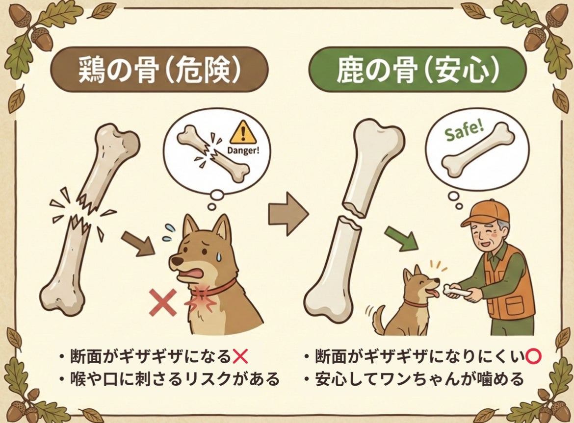さらに、鹿肉の骨は鶏の骨と違い、割れても断面がギザギザになりにくいという特徴もあります。