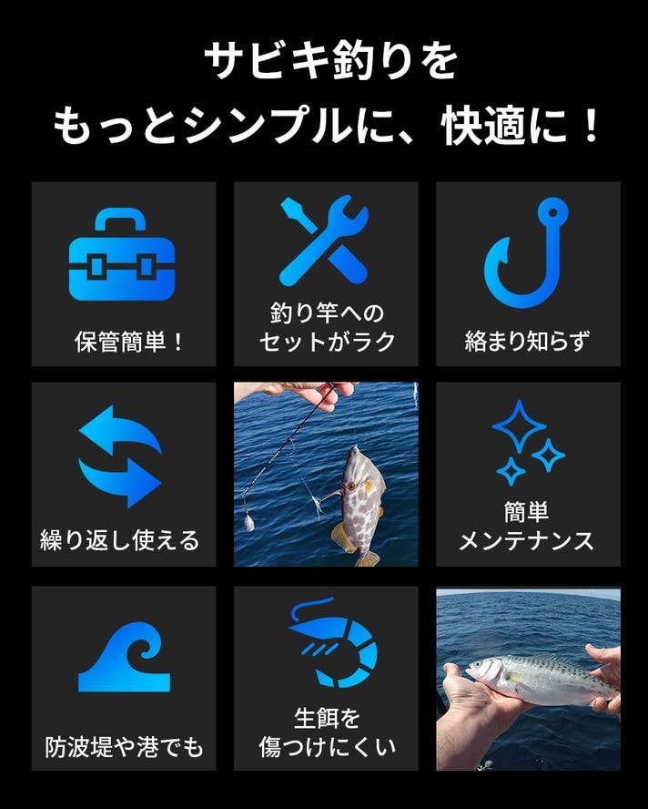 針が絡みづらく、収納もスムーズ。セットアップはわずか10秒で完了する新型サビキ。何度も使えて経済的。水洗いだけでお手入れ簡単。傷んだ枝針だけを個別に交換できるので、ゴミが少なく環境にも優しい製品です。