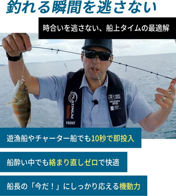 「上げて!下ろして!」の船長の指示にも即対応でき、貴重な沖釣り時間を最大限に活用できます。”お祭り”(絡まり)直しに追われてチャンスを逃す…そんな釣りあるあるとも無縁!