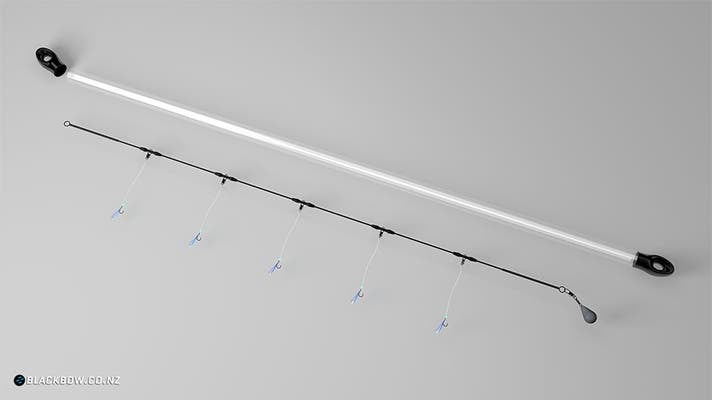 あらかじめオモリとミニトレース(枝針)を取り付けたBlackBowリグを、あなたの釣り竿のメインライン(道糸)に取り付けるだけで、すぐに釣りを始められます。