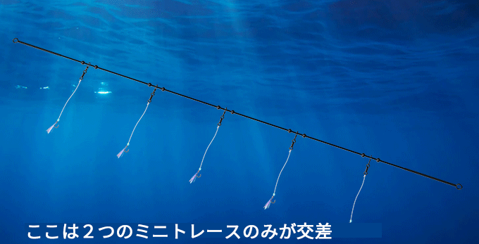 通常のサビキ仕掛けは柔らかい幹糸にハリスが取り付けられているだけの構造ですが、幹糸にあたる部分がロッドとなっており、ハリスが一定間隔を保ち続けることにより絡まりを防ぐことが可能となっています。