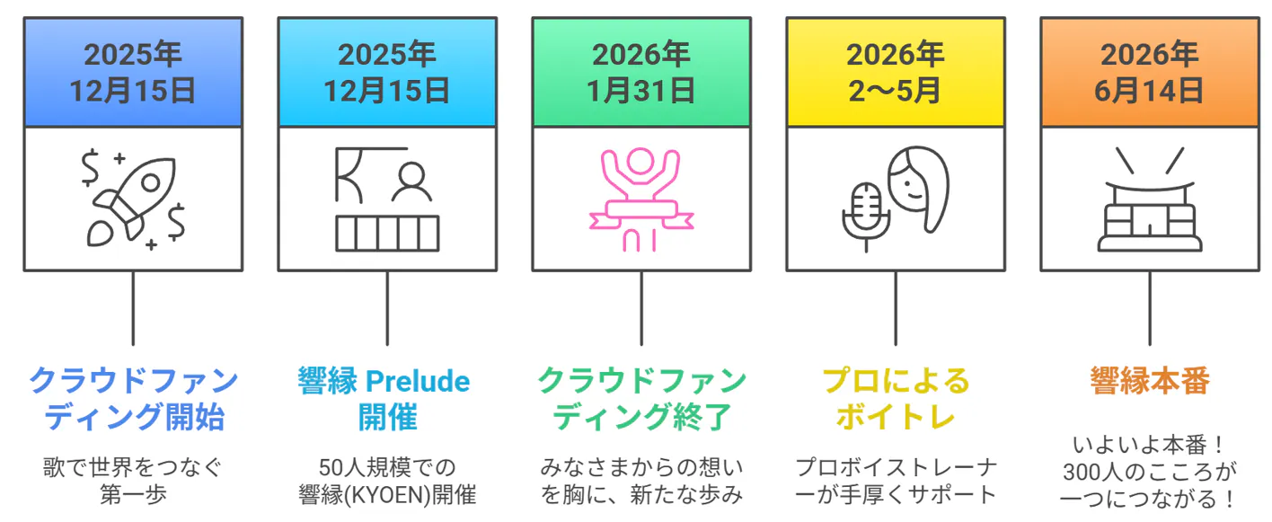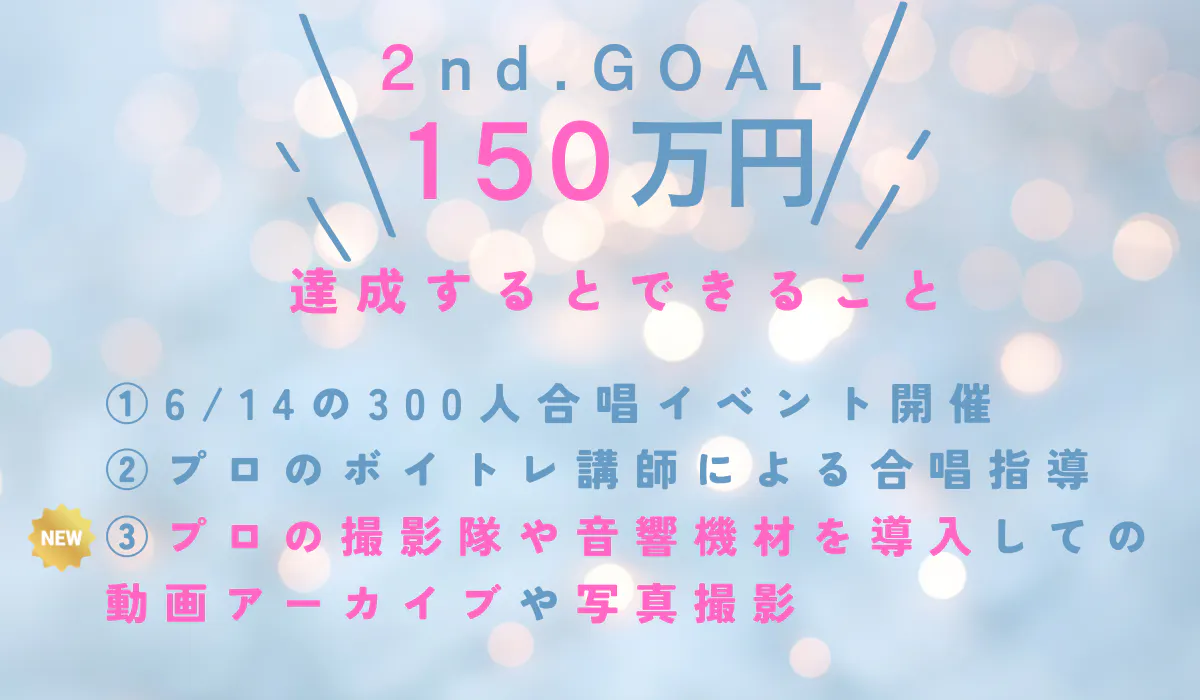 2026/02/02 21:02この度は、12月15日から1月31日まで「あなたの歌で世界をつなぐプロジェクト響縁(KYOEN)」のクラウドファンディングにたくさんのご支援、応援を本当にありがとうございました!!今回は主催3人からのお礼のメッセージを送らせていただきます。まずは和田より↓本プロジェクトをご覧いただき、そしてご支援・応援を寄せてくださり、本当にありがとうございます。私たちは、2026年6月14日に大田区産業プラザPiOで、300人合唱を通じて“歌で人と人がつながる場”を共創したいと思っています。皆さま一人ひとりの想いが、この挑戦の力そのものです。いただいたご縁を大切に、当日、心が震えるような時間を必ず形にしてまいります。引き続き、どうぞよろしくお願いいたします。 響縁(KYOEN)実行委員会和田淳之介次は渡部より↓この度は【あなたの歌で世界をつなぐプロジェクト響縁】にご支援、並びにご参加頂きありがとうございました!皆さまのお陰で私たちはここまで活動を続けてこれました。ひとまず響縁のクラファン挑戦は幕を閉じましたが、響縁の本番は6/14ですのでまだまだこれからです。今以上にエネルギッシュに、このイベントを創り上げていきますので、引き続きどうぞよろしくお願いいたします。響縁(KYOEN)実行委員会渡部龍最後に田中より↓この度はクラファンを通してたくさんの方にサポート、ご支援、お力添えをいただきました。ご報告が遅くなりましたが、おかげさまでクラファン目標は今回達成できなかったものの、55人の方々からのご支援と共に468,750円もの資金を集めることができました。本当にありがとうございました!!ここからさらに皆様からのパワーをいただき、引き続き6/14の響縁第一章となるイベントへと向かって邁進していきたいと思います。また、響縁は300人、500人、1000人と皆様のお力をお借りしながら一緒に育てていく。そんなプロジェクトだとも思っています。歌で世界がつながる感動をこれからもご一緒に♡各リターンのご案内は準備が整い次第、個別にご連絡させていただきます。どうぞよろしくお願いいたします。響縁(KYOEN)実行委員会田中みゆき↑6/14はきっとこんな景色になると今からワクワクでイメージを膨らませておきます♪それではまた。個別にてご連絡や、活動報告などもさせていただきますね!引き続き、どうぞよろしくお願いいたします!!ありがとうございました。 もっと見る