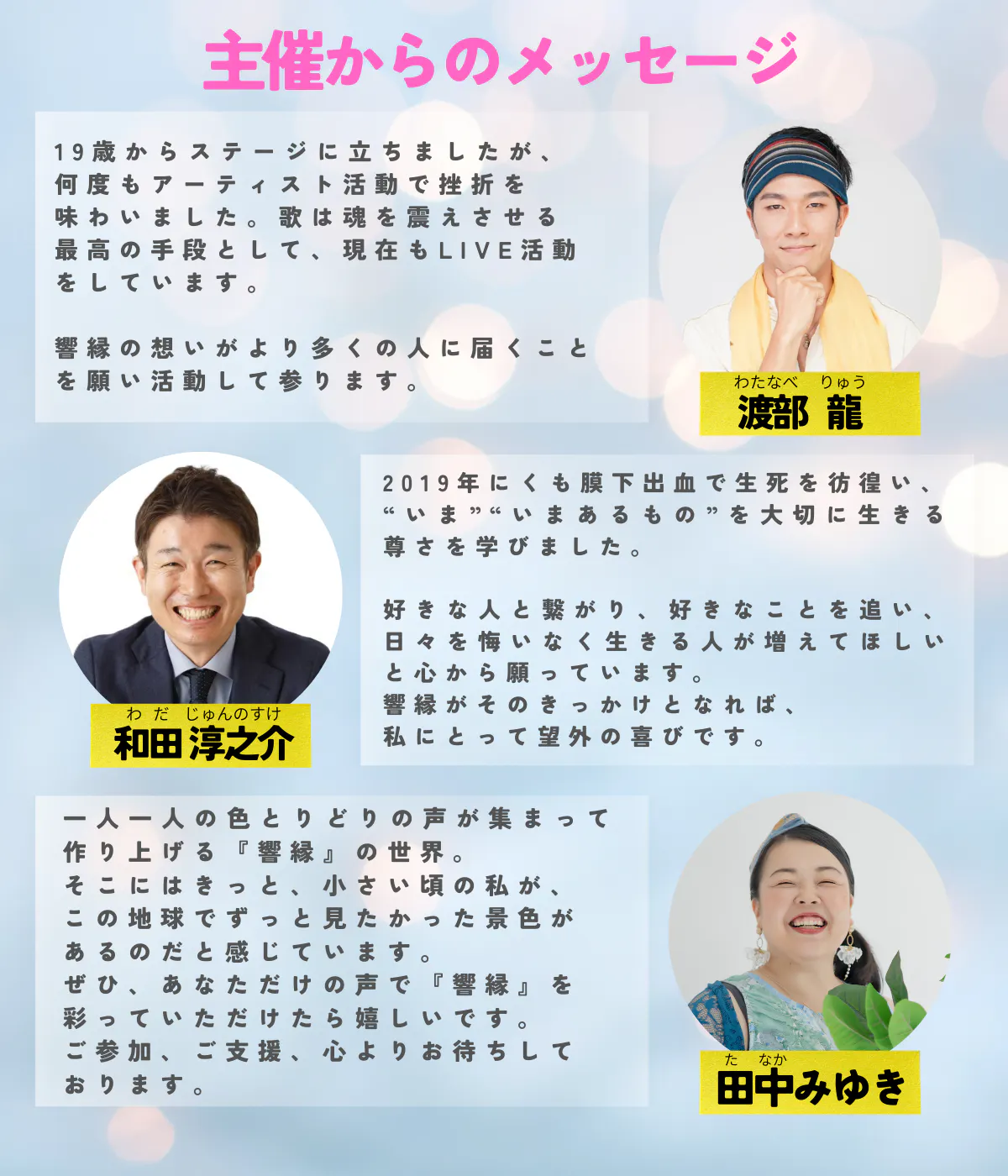 渡部龍(左)、田中みゆき(中)、和田淳之介(右)