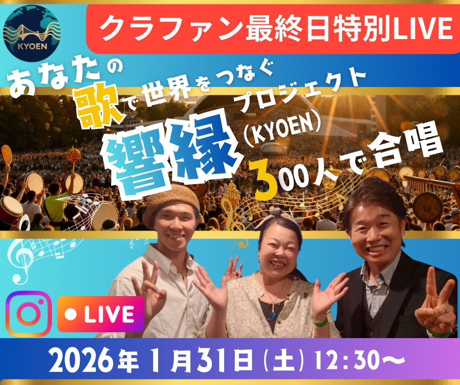この度は、12月15日から1月31日まで「あなたの歌で世界をつなぐプロジェクト響縁(KYOEN)」のクラウドファンディングにたくさんのご支援、応援を本当にありがとうございました!!今回は主催3人からのお礼のメッセージを送らせていただきます。まずは和田より↓本プロジェクトをご覧いただき、そしてご支援・応援を寄せてくださり、本当にありがとうございます。私たちは、2026年6月14日に大田区産業プラザPiOで、300人合唱を通じて“歌で人と人がつながる場”を共創したいと思っています。皆さま一人ひとりの想いが、この挑戦の力そのものです。いただいたご縁を大切に、当日、心が震えるような時間を必ず形にしてまいります。引き続き、どうぞよろしくお願いいたします。 響縁(KYOEN)実行委員会和田淳之介次は渡部より↓この度は【あなたの歌で世界をつなぐプロジェクト響縁】にご支援、並びにご参加頂きありがとうございました!皆さまのお陰で私たちはここまで活動を続けてこれました。ひとまず響縁のクラファン挑戦は幕を閉じましたが、響縁の本番は6/14ですのでまだまだこれからです。今以上にエネルギッシュに、このイベントを創り上げていきますので、引き続きどうぞよろしくお願いいたします。響縁(KYOEN)実行委員会渡部龍最後に田中より↓この度はクラファンを通してたくさんの方にサポート、ご支援、お力添えをいただきました。ご報告が遅くなりましたが、おかげさまでクラファン目標は今回達成できなかったものの、55人の方々からのご支援と共に468,750円もの資金を集めることができました。本当にありがとうございました!!ここからさらに皆様からのパワーをいただき、引き続き6/14の響縁第一章となるイベントへと向かって邁進していきたいと思います。また、響縁は300人、500人、1000人と皆様のお力をお借りしながら一緒に育てていく。そんなプロジェクトだとも思っています。歌で世界がつながる感動をこれからもご一緒に♡各リターンのご案内は準備が整い次第、個別にご連絡させていただきます。どうぞよろしくお願いいたします。響縁(KYOEN)実行委員会田中みゆき↑6/14はきっとこんな景色になると今からワクワクでイメージを膨らませておきます♪それではまた。個別にてご連絡や、活動報告などもさせていただきますね!引き続き、どうぞよろしくお願いいたします!!ありがとうございました。