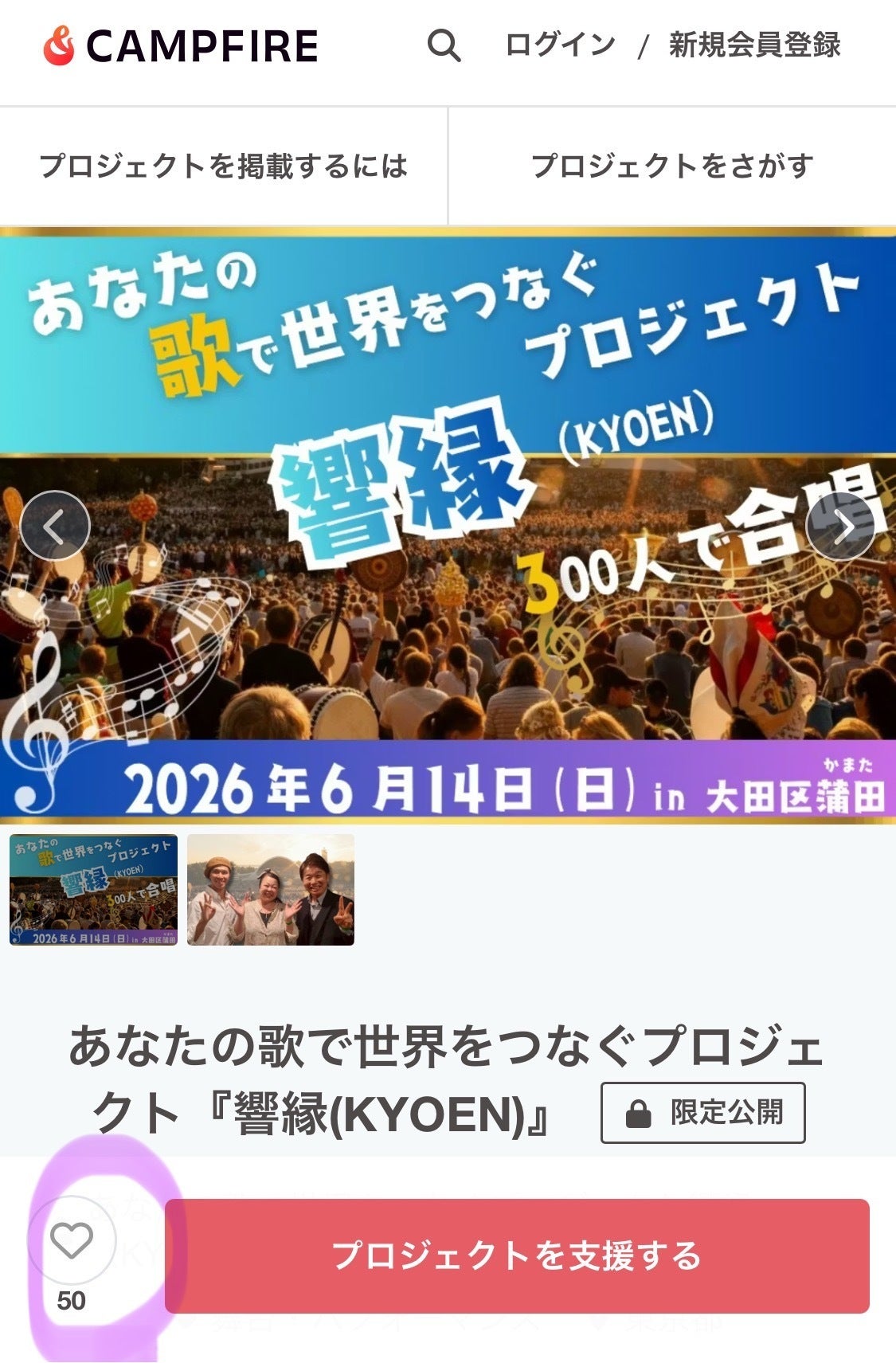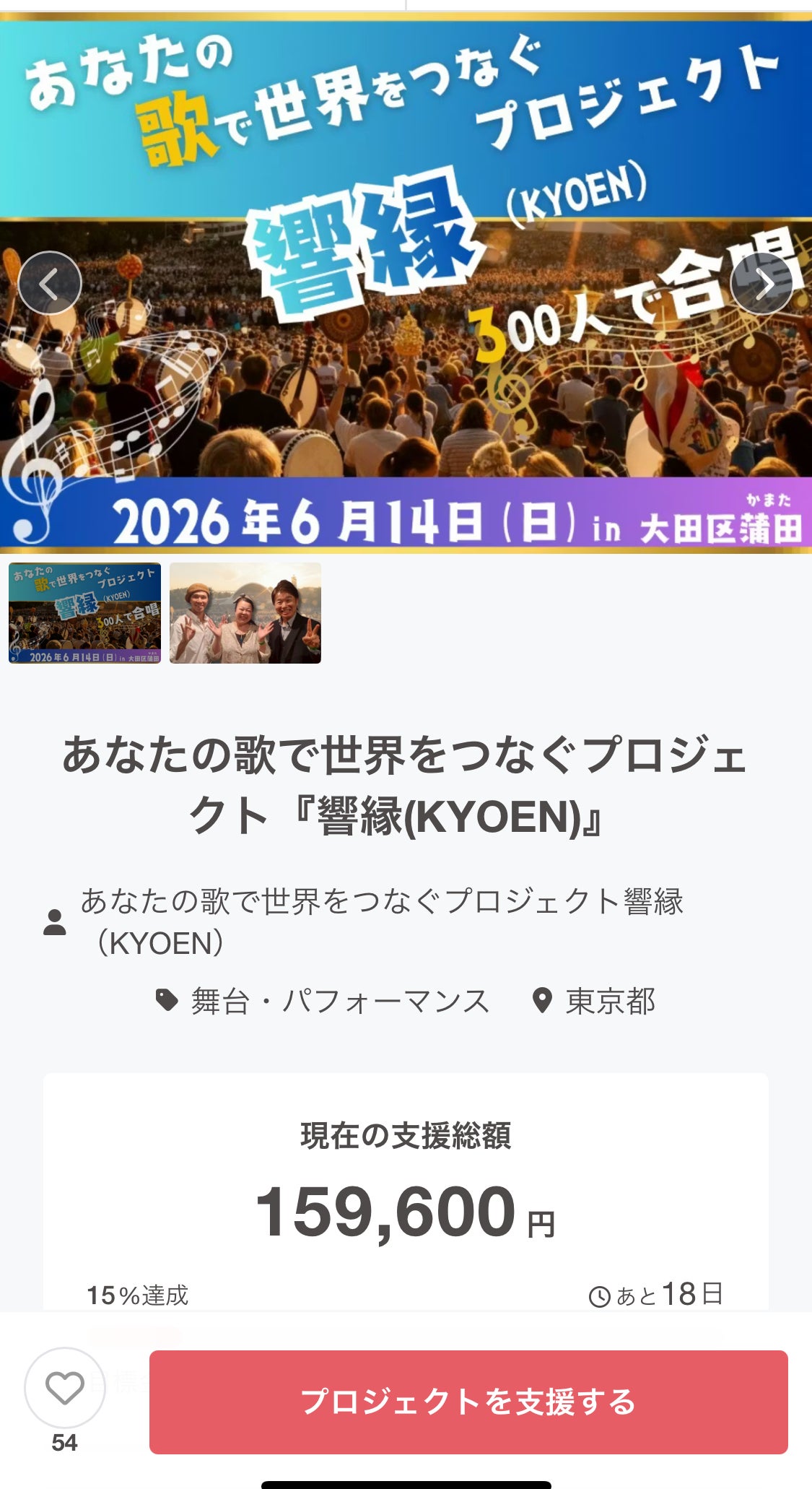 あなたの歌で世界をつなぐプロジェクト響縁(KYOEN)実行委員会です!なかなかスローな歩みではありますが本日ご支援の総額が15万円を超え、54人の方からお気に入りをいただいております!!本当にありがとうございます。正直、響縁のプロジェクトはいきなり広がっていくようなものではないのかもしれません。また、表現すること、歌うことは直接的に誰かのお困りごとやお悩みを解決するものには見えないのかもしれません。でも、この現代の日本社会における問題部分の根幹部分にじわじわと染み入っていくような少しずつ少しずつ広がっていくようなそんな社会貢献プロジェクトでもあるのです。そんなわけで、何度でも言いますが響縁はただの合唱イベントではありません。その辺りの、このクラファンページには書ききれなかった想いやこれからのことはfacebookやインスタグラム、そして、こちらのブログにも少しずつ書き綴っていこうと思っています。あなたの歌で世界をつなぐプロジェクト『響縁(KYOEN)』noteです必ず見たい世界の実現のためにまだまだ歩みを止めずに一歩一歩進んで行こうと思いますので、ぜひ、温かい目で見守っていただき必要な方に届けるためのお力をお貸しいただけたらと思います。改めまして、今後ともどうぞよろしくお願い致します。あなたの歌で世界をつなぐプロジェクト響縁(KYOEN)実行委員会渡部龍和田淳之介田中みゆき