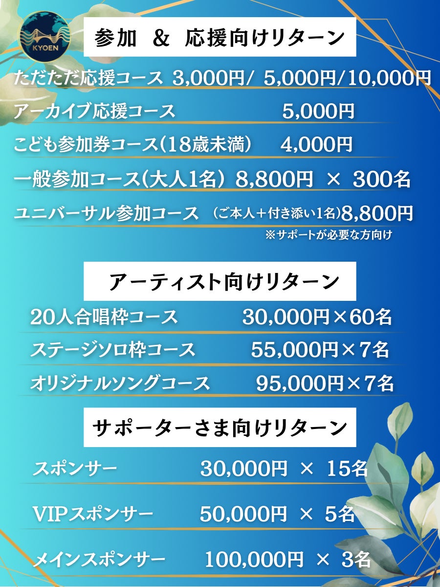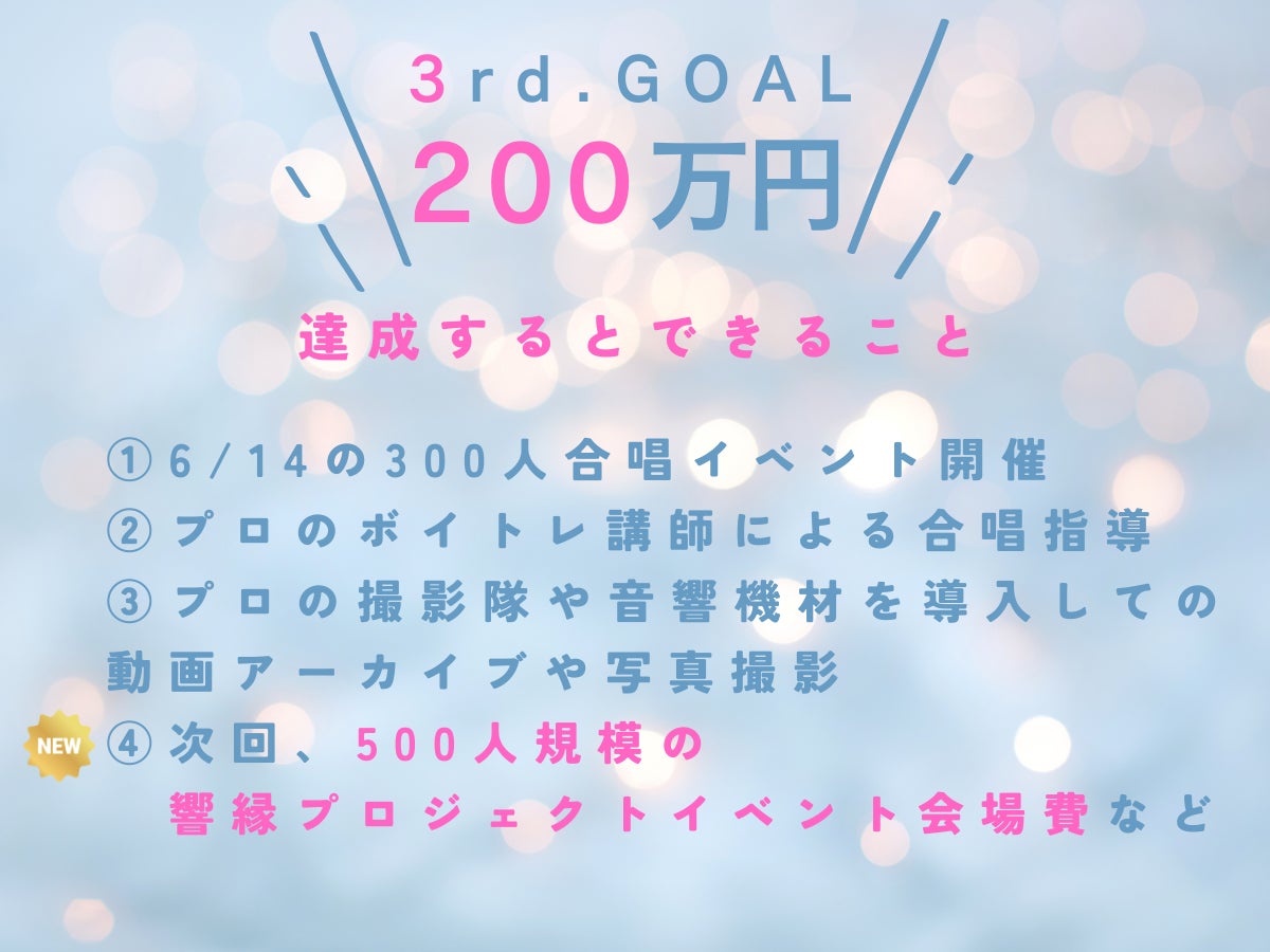 2026/02/02 21:02この度は、12月15日から1月31日まで「あなたの歌で世界をつなぐプロジェクト響縁(KYOEN)」のクラウドファンディングにたくさんのご支援、応援を本当にありがとうございました!!今回は主催3人からのお礼のメッセージを送らせていただきます。まずは和田より↓本プロジェクトをご覧いただき、そしてご支援・応援を寄せてくださり、本当にありがとうございます。私たちは、2026年6月14日に大田区産業プラザPiOで、300人合唱を通じて“歌で人と人がつながる場”を共創したいと思っています。皆さま一人ひとりの想いが、この挑戦の力そのものです。いただいたご縁を大切に、当日、心が震えるような時間を必ず形にしてまいります。引き続き、どうぞよろしくお願いいたします。 響縁(KYOEN)実行委員会和田淳之介次は渡部より↓この度は【あなたの歌で世界をつなぐプロジェクト響縁】にご支援、並びにご参加頂きありがとうございました!皆さまのお陰で私たちはここまで活動を続けてこれました。ひとまず響縁のクラファン挑戦は幕を閉じましたが、響縁の本番は6/14ですのでまだまだこれからです。今以上にエネルギッシュに、このイベントを創り上げていきますので、引き続きどうぞよろしくお願いいたします。響縁(KYOEN)実行委員会渡部龍最後に田中より↓この度はクラファンを通してたくさんの方にサポート、ご支援、お力添えをいただきました。ご報告が遅くなりましたが、おかげさまでクラファン目標は今回達成できなかったものの、55人の方々からのご支援と共に468,750円もの資金を集めることができました。本当にありがとうございました!!ここからさらに皆様からのパワーをいただき、引き続き6/14の響縁第一章となるイベントへと向かって邁進していきたいと思います。また、響縁は300人、500人、1000人と皆様のお力をお借りしながら一緒に育てていく。そんなプロジェクトだとも思っています。歌で世界がつながる感動をこれからもご一緒に♡各リターンのご案内は準備が整い次第、個別にご連絡させていただきます。どうぞよろしくお願いいたします。響縁(KYOEN)実行委員会田中みゆき↑6/14はきっとこんな景色になると今からワクワクでイメージを膨らませておきます♪それではまた。個別にてご連絡や、活動報告などもさせていただきますね!引き続き、どうぞよろしくお願いいたします!!ありがとうございました。 もっと見る