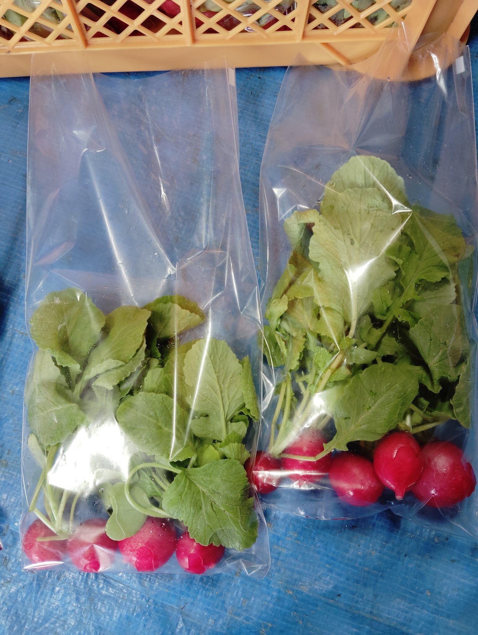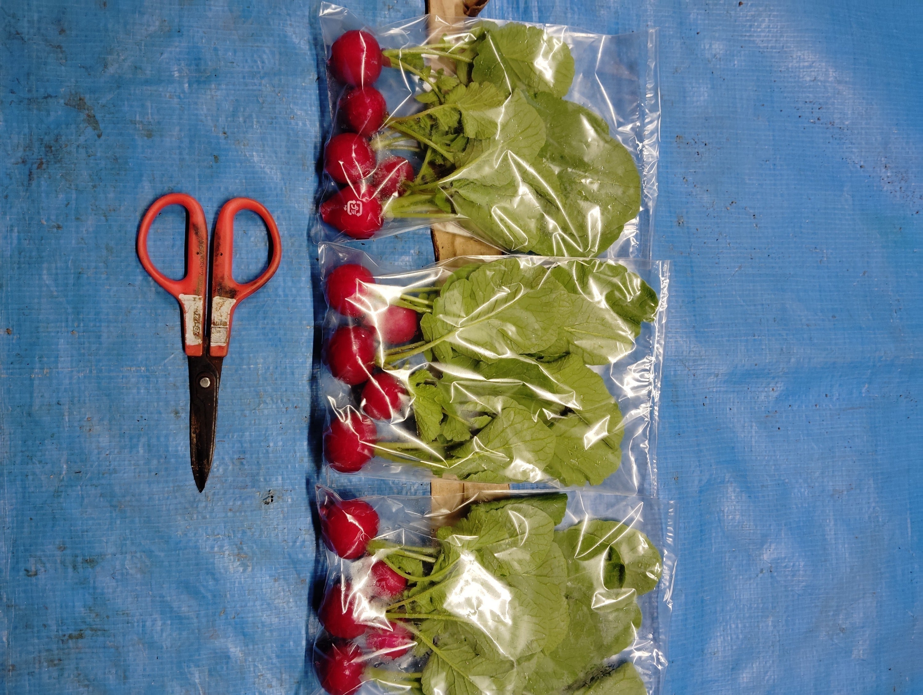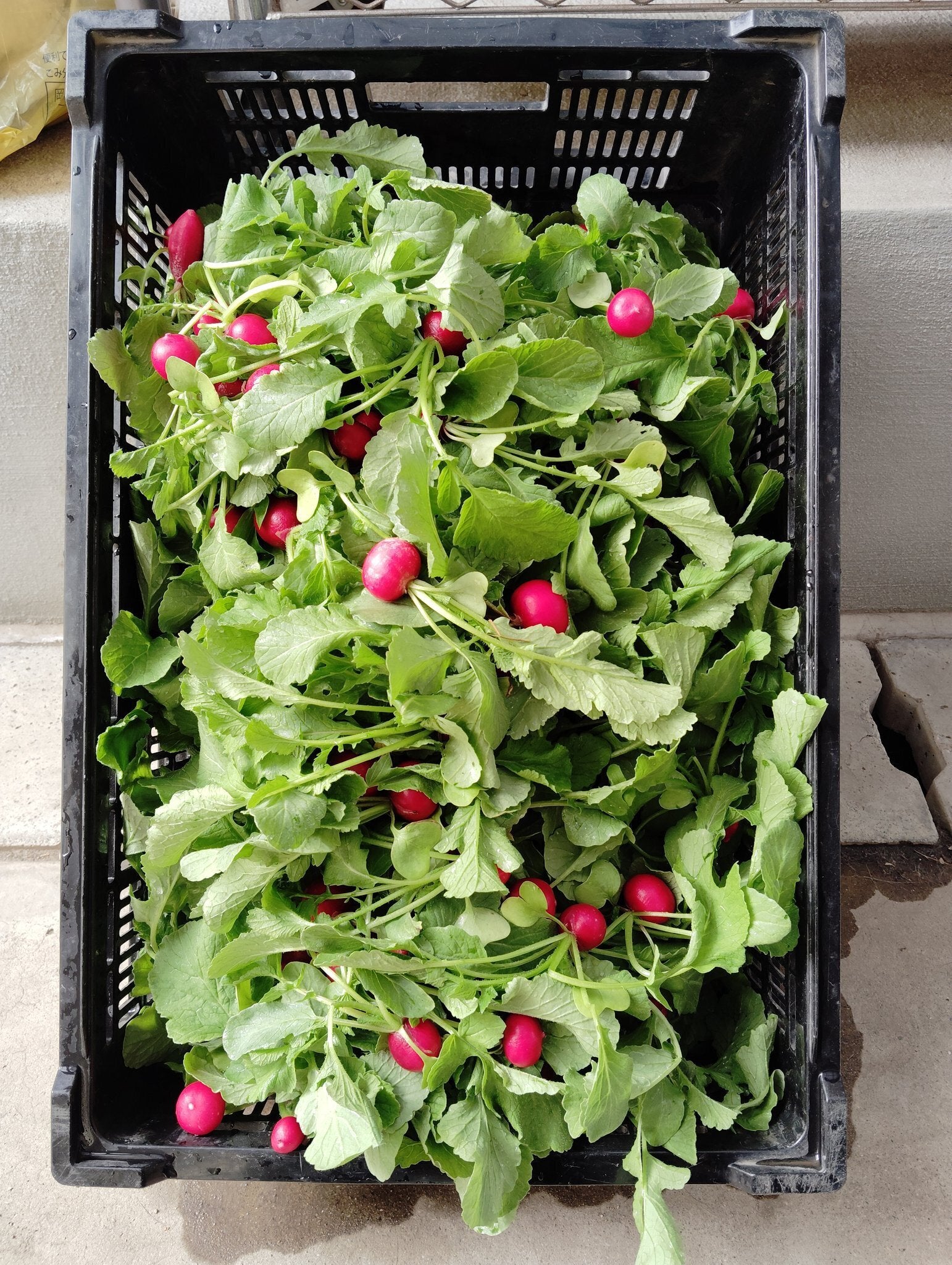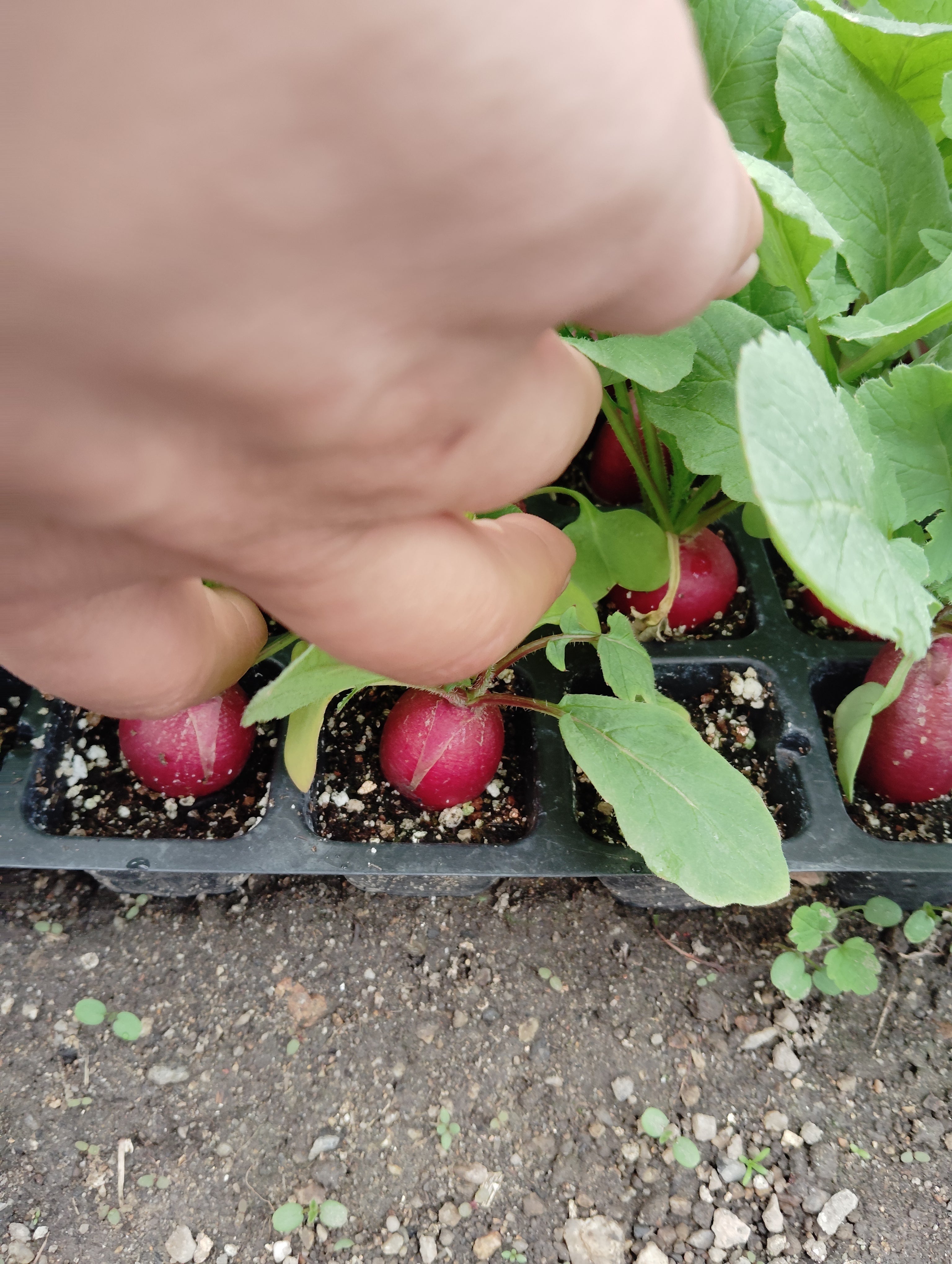 現在は連結ポットで72穴のラディッシュを育て、芽が出たら連結ポットごと植え替える取り組みを行っています。1パレットで5個袋入14袋を8パレット(112袋)。2m×1.5m=3㎡の圃場で1週間に1日で4週間しております。