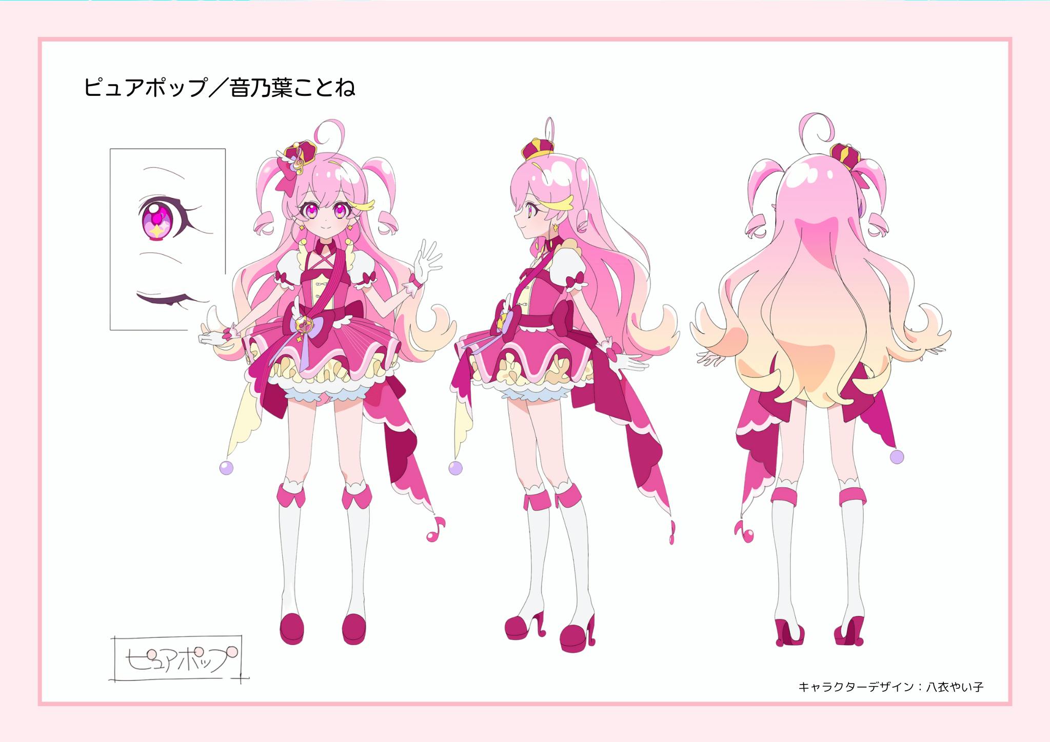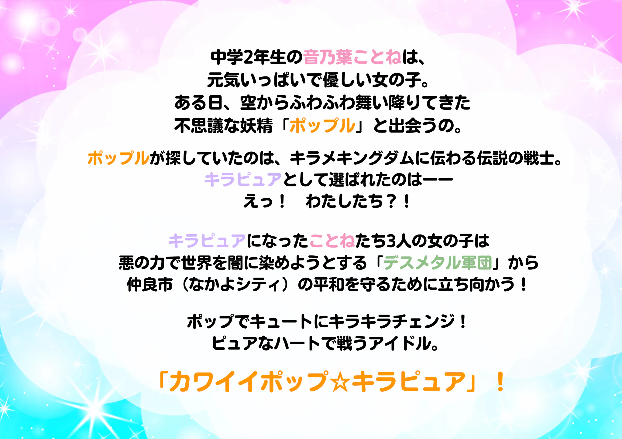 ・ピュアポップ/音乃葉ことね:ドジで天然だけど、優しくて行動的な女の子。愛音中学校に通う中学2年生。人の役に立つことが大好きな、純度100%の善意の子。妖精ポップルを助けた事をきっかけにキラピュアに変身。悪者と戦いながら大人気アイドルとして活動している。