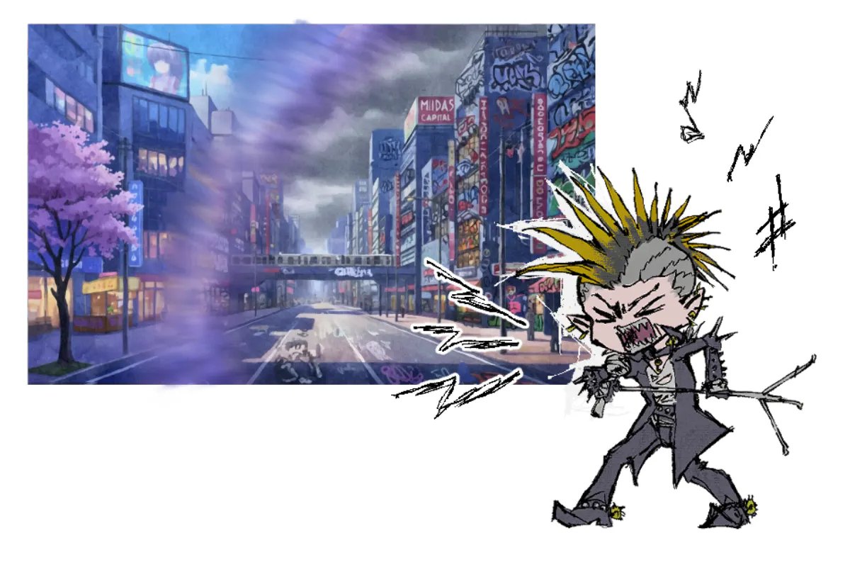 本作では、異なるアートスタイルのキャラクターが同じ画面に共存するという、実験的なビジュアル表現を用います。主人公の絵柄だけが周囲と違うことで、生きづらさや馴染めなさをビジュアル的に表現する試みです。