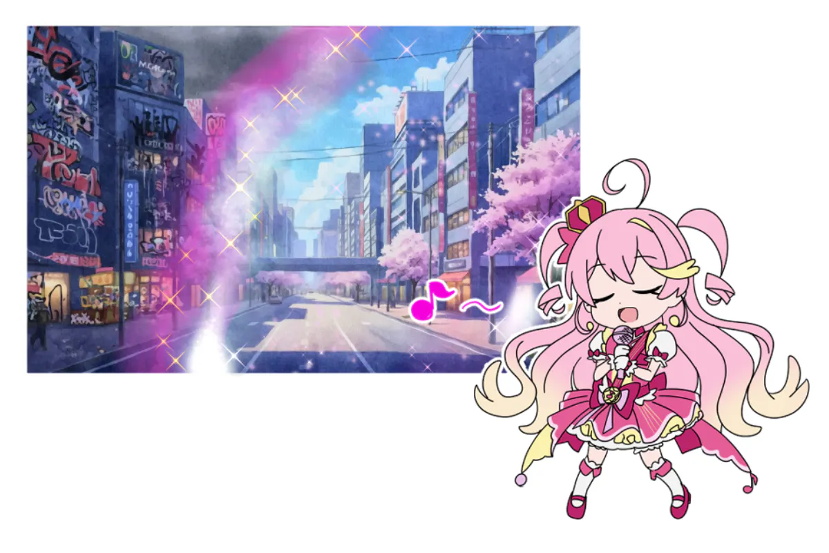 また、魔法少女作品でよく見られる「戦いの後に謎の光で街が元どおりになる」演出を、本作では 「世界観そのものを変える能力」として描写します。これは、コンテンツの価値観が社会全体に与える影響のメタファーです。悪者軍団も抵抗活動と称してゲリラライブなどをすると、背景作画がそのキャラに合ったものに変わります。主人公・ノエルはその力を使い、世界を闇に染めようと活動します。