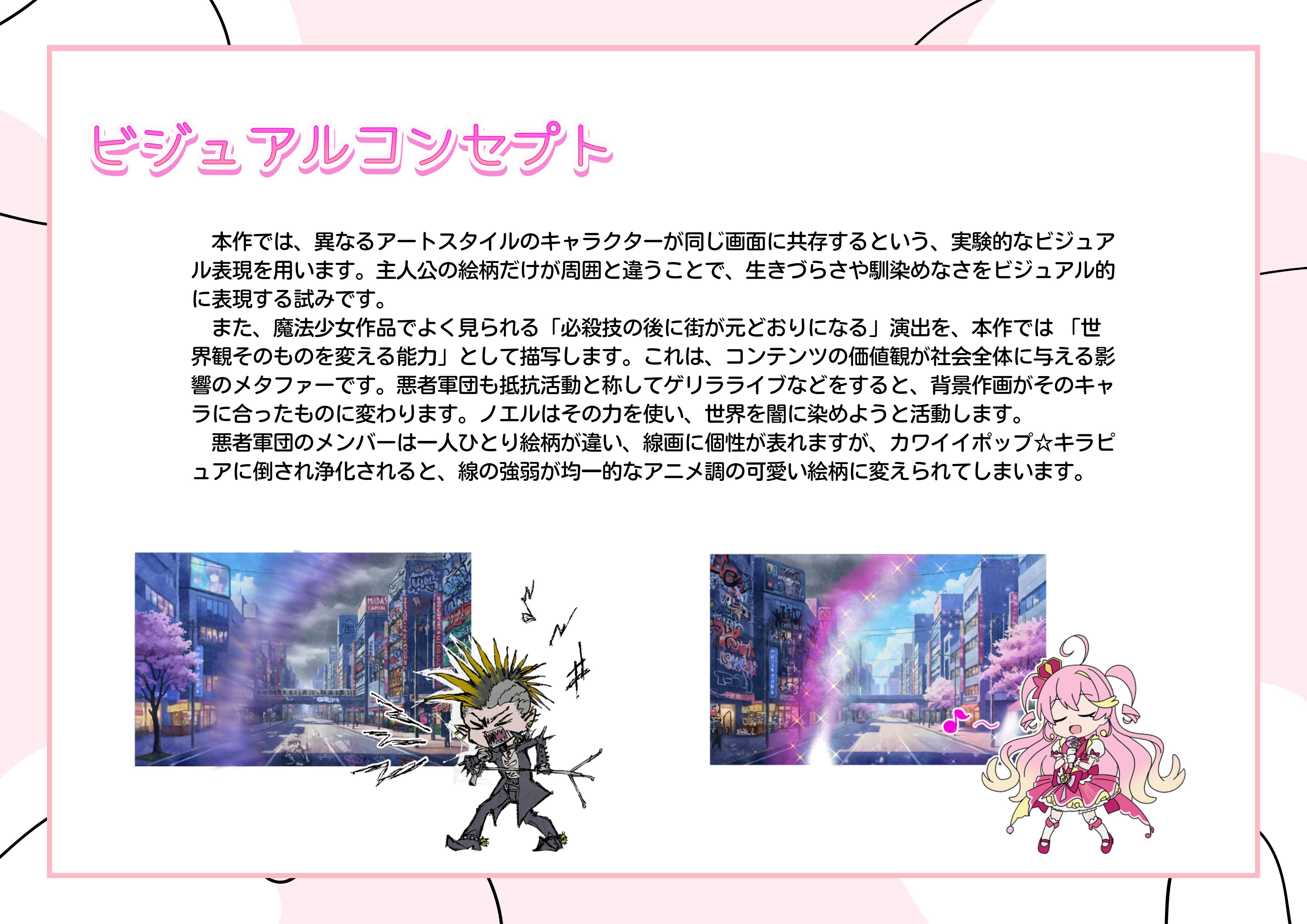 世界に反抗し自分の個性を出そうとする悪者達のキャラクターデザインを、それぞれ別のイラストレーターが作画を担当することによって、作品のテーマをより際立たせています。