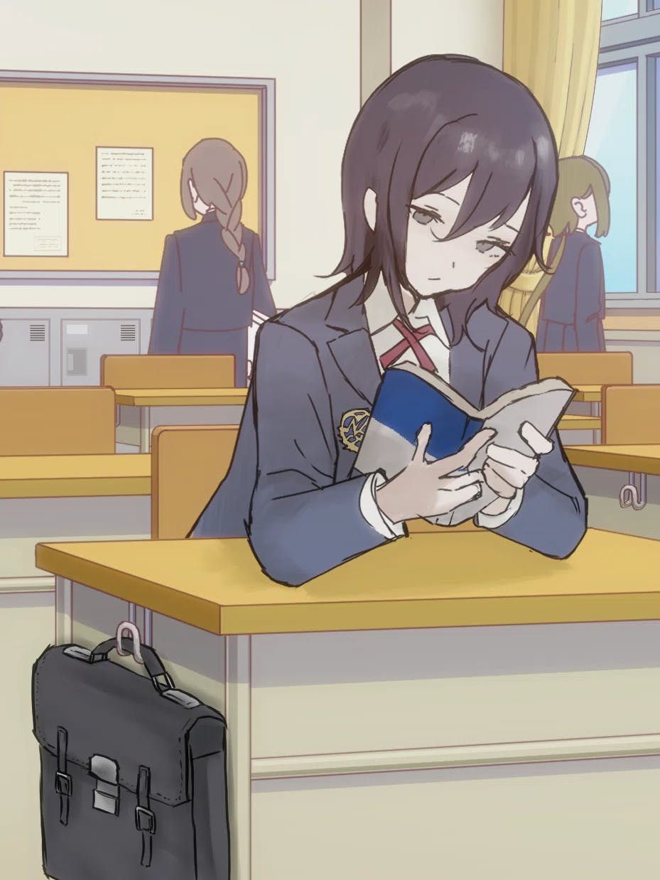 コンセプトアートでも、アニメ調の教室の中にぽつりと座って本を読む、不均一な線で描かれた独特な絵柄の少女がいます。彼女が今作の主人公、伊藤ノエルです。