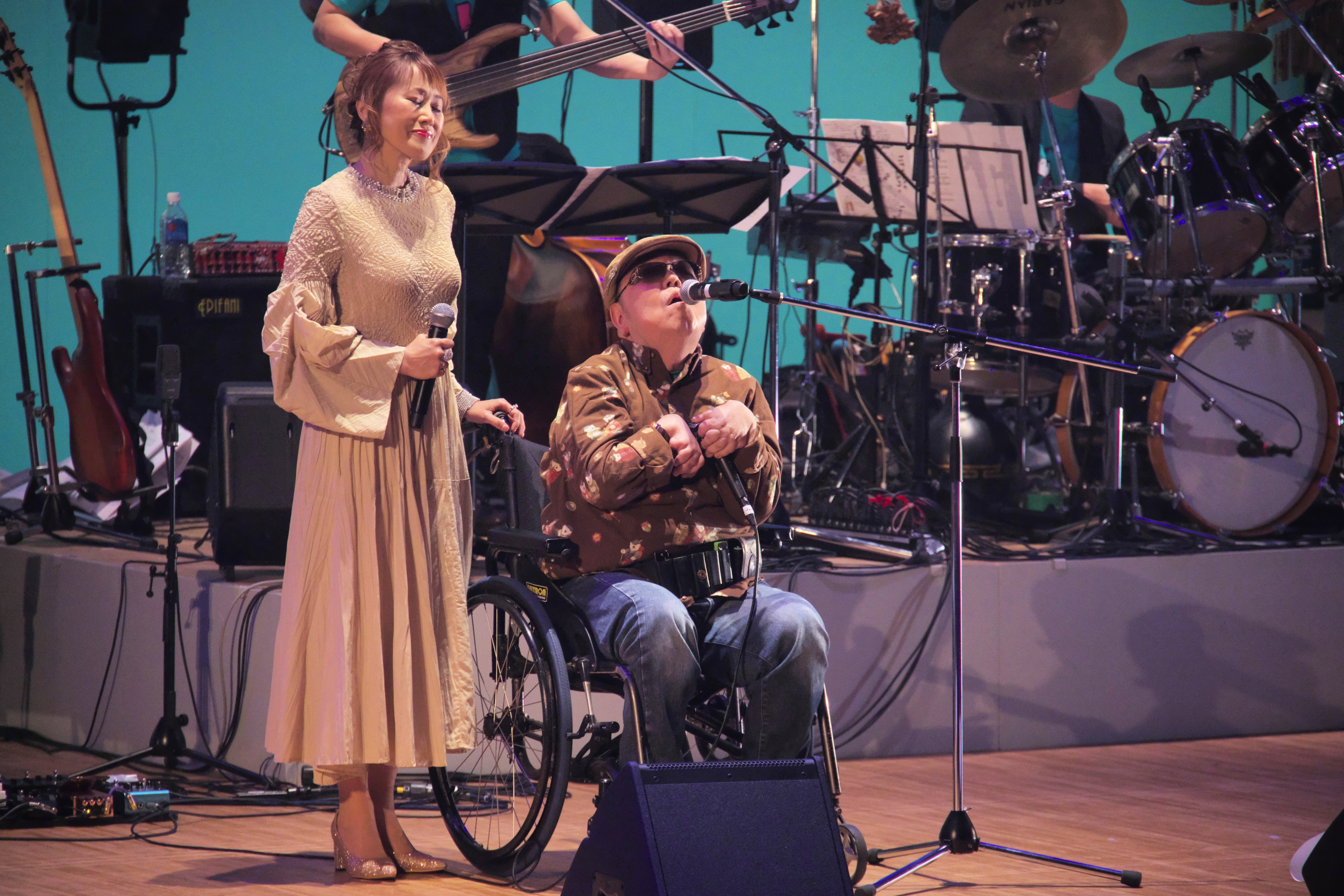(写真)【涙そうそう】を響き合わせる麻生かほ里さんと 全盲車いすのハーモニスト山下純一さん