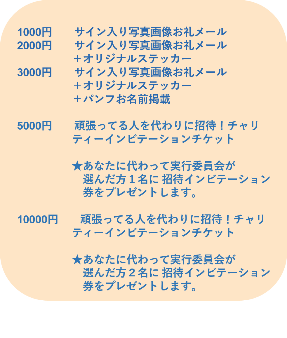 2025/12/07 14:00ファースト目標達成を記念しましてとてもうれしくて、誰かにこの幸せをプレゼントしたい!そんな発想からチャリティチケットを作りました♡★当日来場できないけど応援したい!という方に★ あなたに代わって 実行委員会が選んだ方 1名に 招待インビテーション券をプレゼントします。 いつも頑張ってる人、障がいをお持ちの方、逗子の社会活動を頑張っている方などどなたになるかは、お任せください!きっとあなたの想いが その方の幸せな時間を作るでしょう。誰かの幸せな時間に。【頑張ってる人を代わりに招待!チャリティーインビテーションチケット】5000円と10000円を作りました。5000円は1名の方 10000円では2名の方をご招待いたします。どちらかの画像で選んでくださいね。 ・チケット1枚 は 実行委員会が直接 ご招待の方にお渡しします。温かなご支援お待ちしています! もっと見る