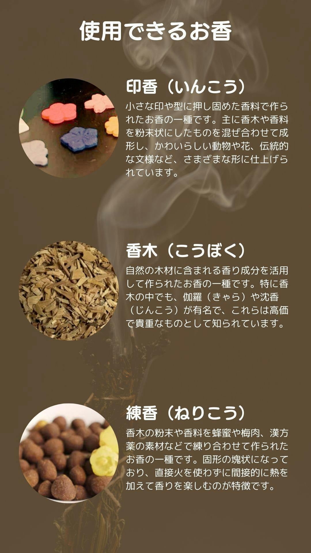 本製品は「香木」「練香」「印香」などの香料に対応していますが、それ以外の香料を使用すると故障の原因となる場合がありますので、ご注意ください。