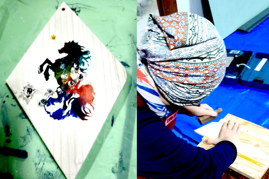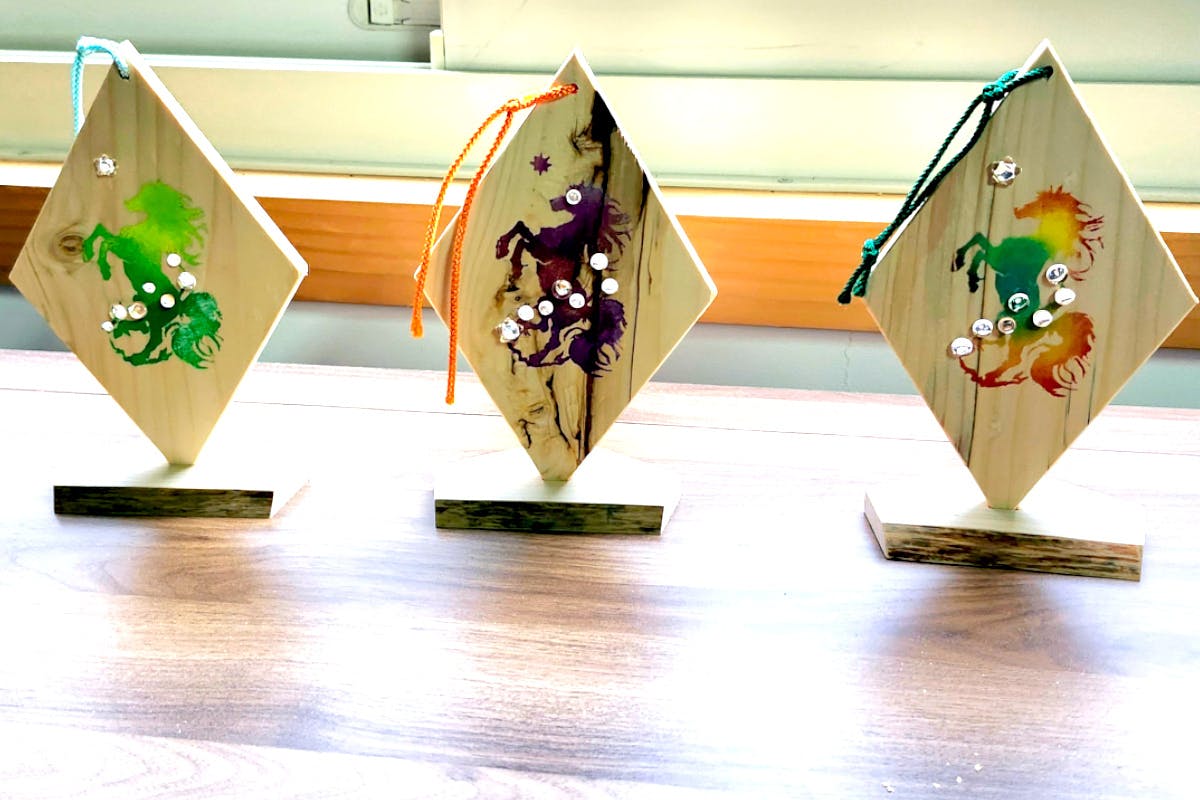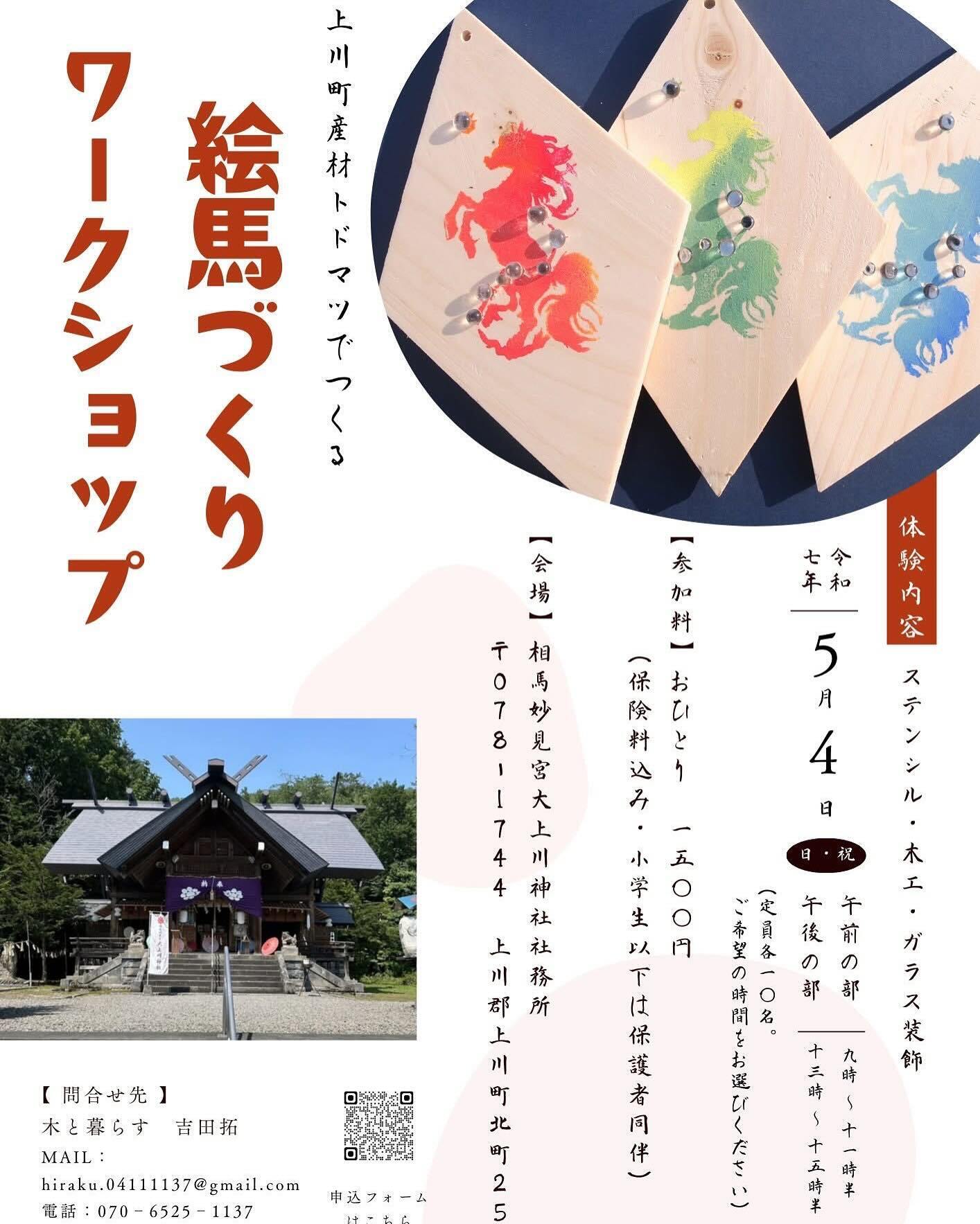 地域おこし協力隊の吉田さんが企画・参加してくれたイベントで、「上川町産トドマツで絵馬を作る」ワークショップを行いました。町産材を使い、オリジナルの絵柄のステンシル型で絵付けをし、ドリルで穴をあけ、同じく協力隊であり、ランプワーカー(ガラス職人)である守屋さんの作成したガラスパーツをはめ込んで世界に一つだけの絵馬を作る活動をいたしました。