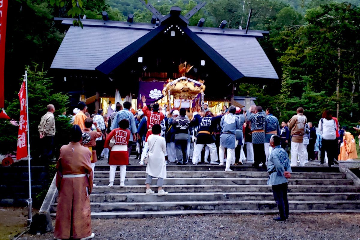 7月16日の本祭では、神輿渡御があり、町を御神輿が練り歩きます。大上川神社では「宮衆」という神輿会が活動しております。宮衆を中心とし、各地域の神輿会、毎年の当番町の祭典正副委員長・各係など総勢200名前後でお祭りを盛り上げており、町内同士の交流も含め大切な祭事となっております。東旭川豊田獅子舞保存会による獅子舞も各町内の御旅所で奉納されます。