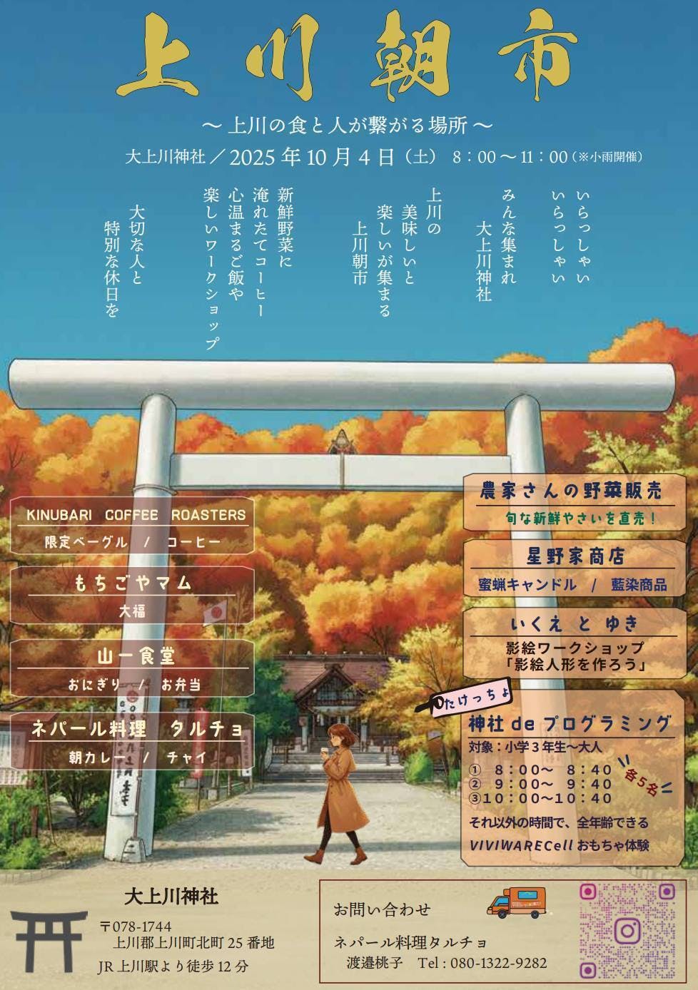 上川町に移住、起業された方々と上川町の農家さんとともに今年初めて朝市を行いました。町内の「ネパール料理タルチョ」の渡邉さんと「上川町の農家さんが育てたおいしい野菜を売る朝市を神社でしたい」と2年ほど前から企画しておりまして、今年実現ができました。当日は上川のグルメ、上川の野菜が販売されました。大盛況で、町内外からお客様がいらっしゃり、すぐに売り切れました。