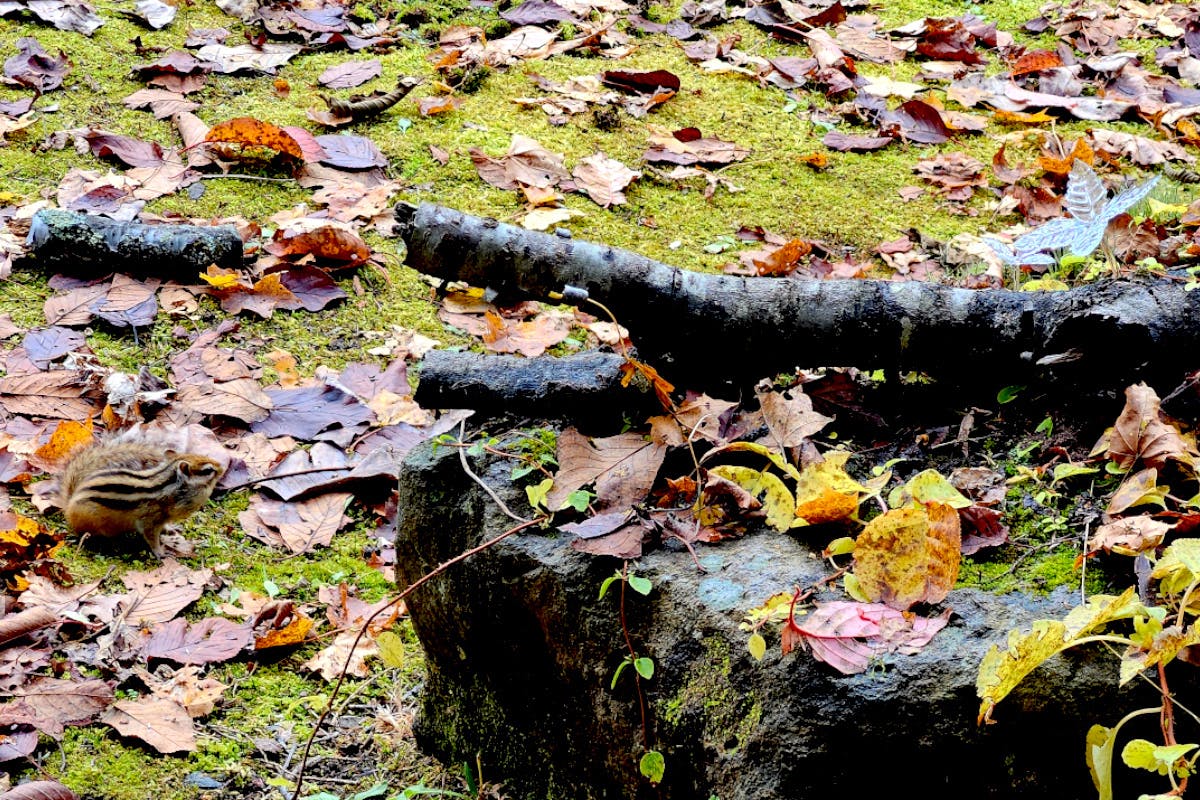 シマリスが走り回る裏庭に展示された野外展示のガラス こうして新しく上川に来た人と昔から住んでいる人との交流が生まれる光景は、神社だったからなのではないかという感想も多くいただきました。