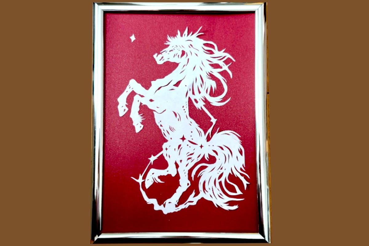 御創祀120年記念絵馬・切り絵御朱印・幟の 原画と同じ絵柄の切り絵をA4サイズ簡易額入りの手切りで 作成します。