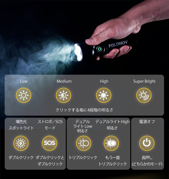 ミニ懐中電灯「FOLOMOV A7」は、5段階の明るさを備えております。