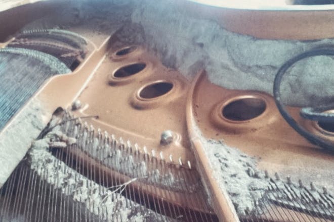 弦の腐食状況 〔ピアノ内部の駒(弦の下にある横長の木材)、弦止め(弦を駒に固定する金属部品)、および弦(塩分の影響により腐食が進行)の様子〕