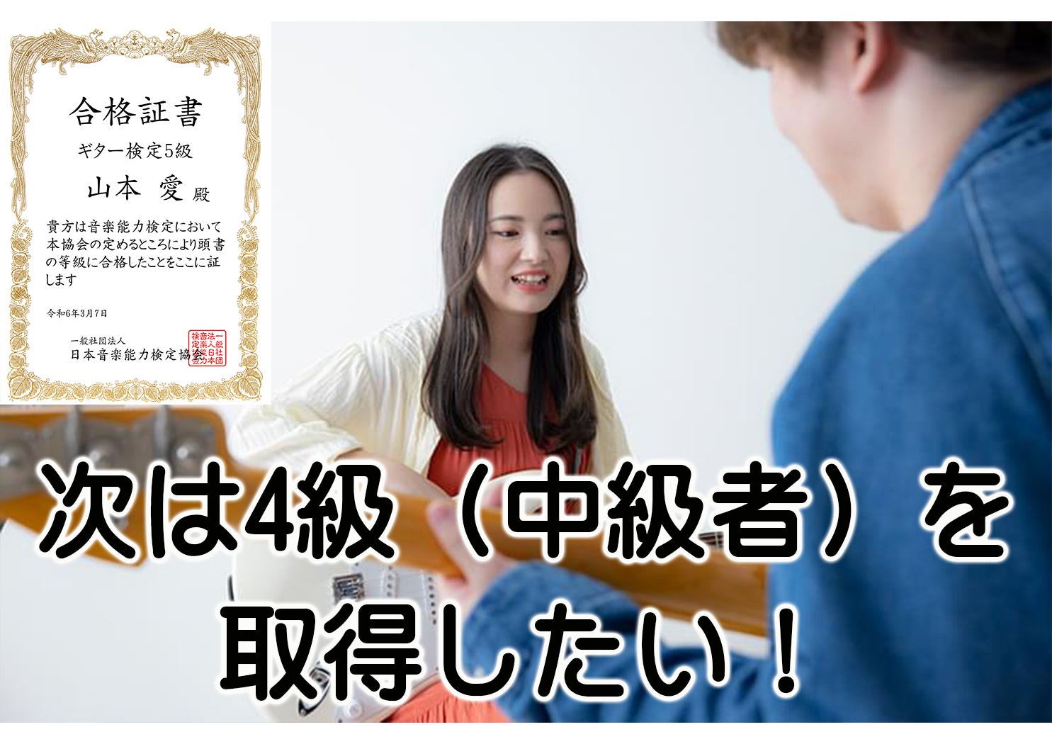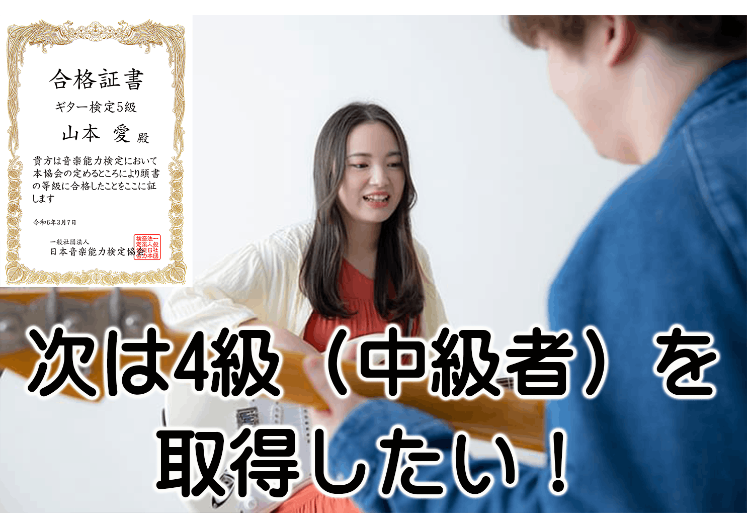 音楽検定の実施により「まずは5級(初級者)を目指してみよう!」「5年くらいギターを練習しているから4級(中級者)は合格したい!」などの明確な目標ができることで、上達意欲や練習意欲をより促進できるものと確信しております。