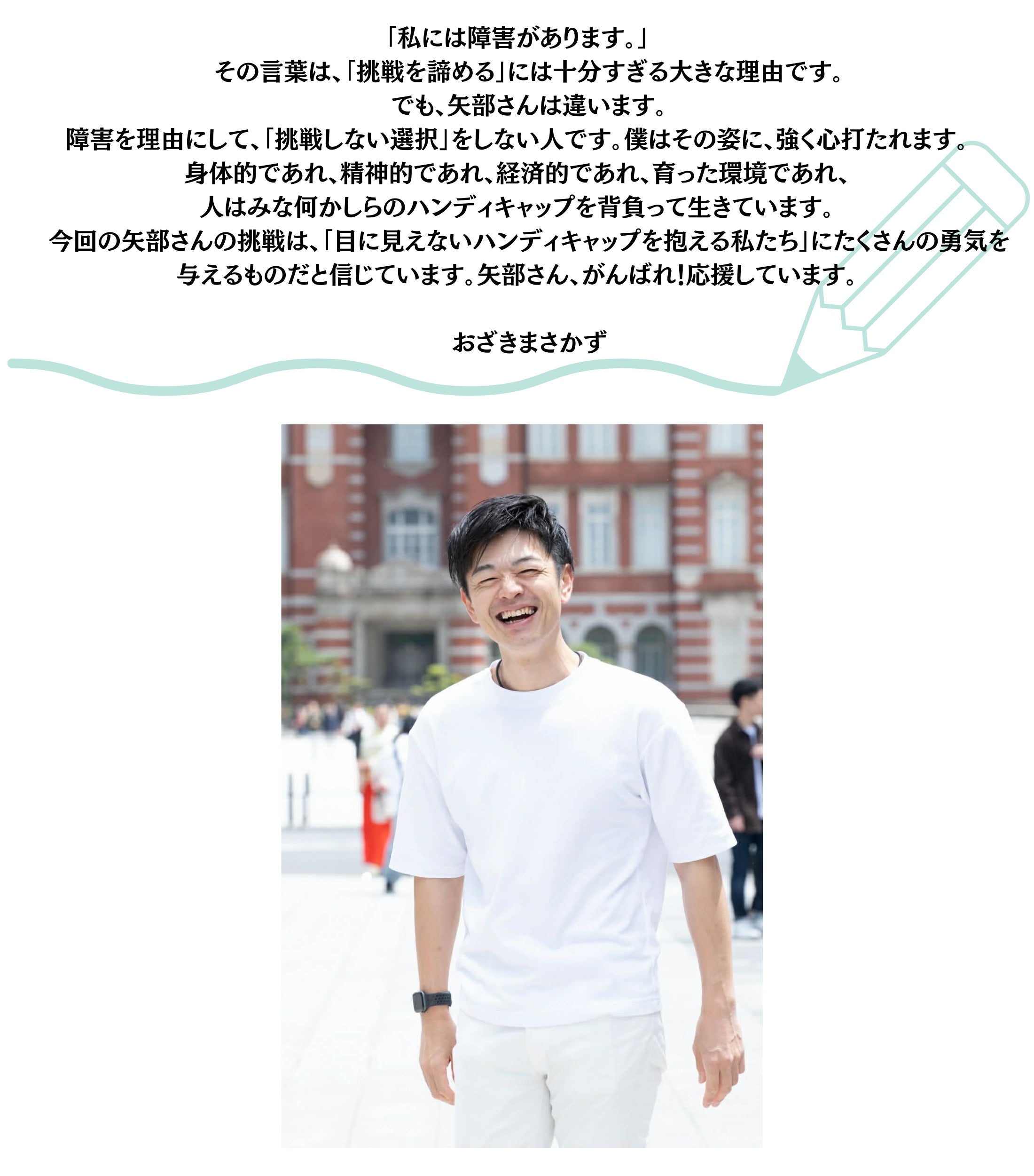 特に聴覚障害を持った方々、またそのご家族が僕の挑戦する姿を見ていただくことで、結果として背中を押すことになれば嬉しいと考えています。