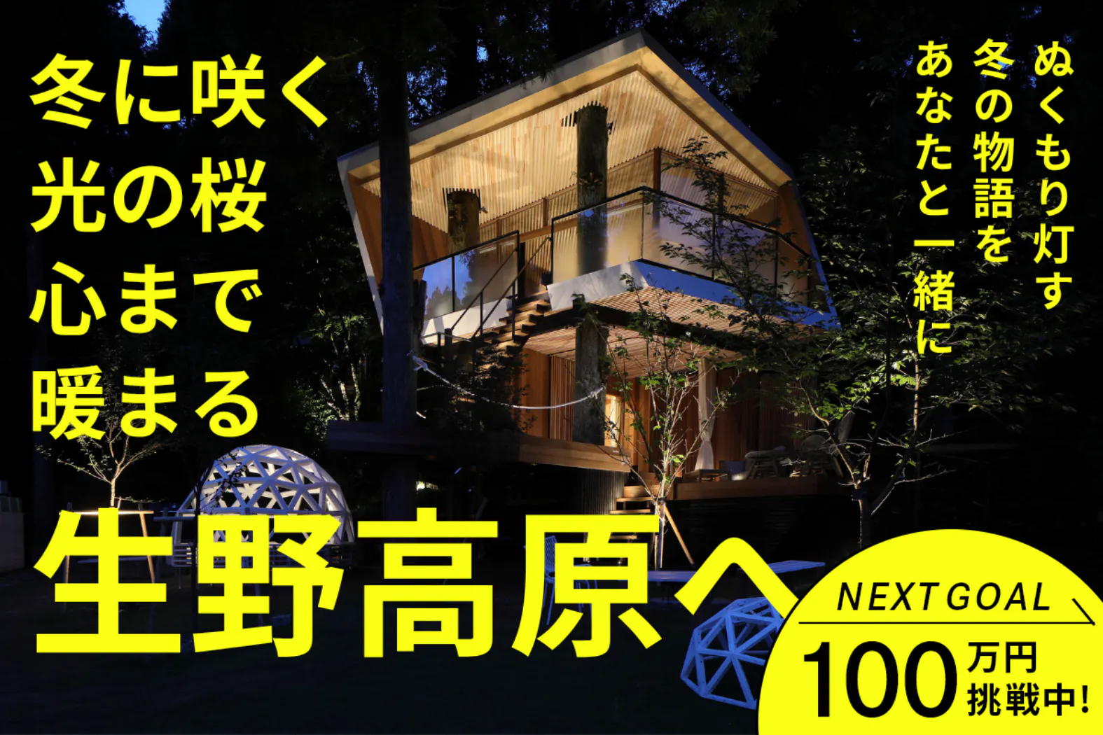 このクラウドファンディングでは、SUGOMoRIリゾート 生野高原の敷地をイルミネーションで幻想的にライトアップし、訪れた人々が大切な人と過ごす特別な冬の思い出をつくる空間を実現したいと考えています。