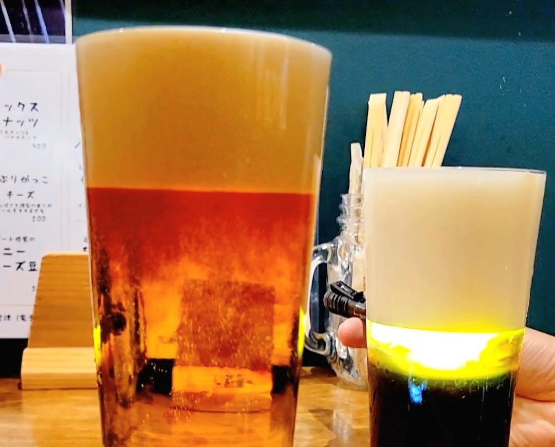 画像右の『サンライズ』は、オーロラと逆で液体部分が黒ビール、泡は普段のビールなのだそう。
