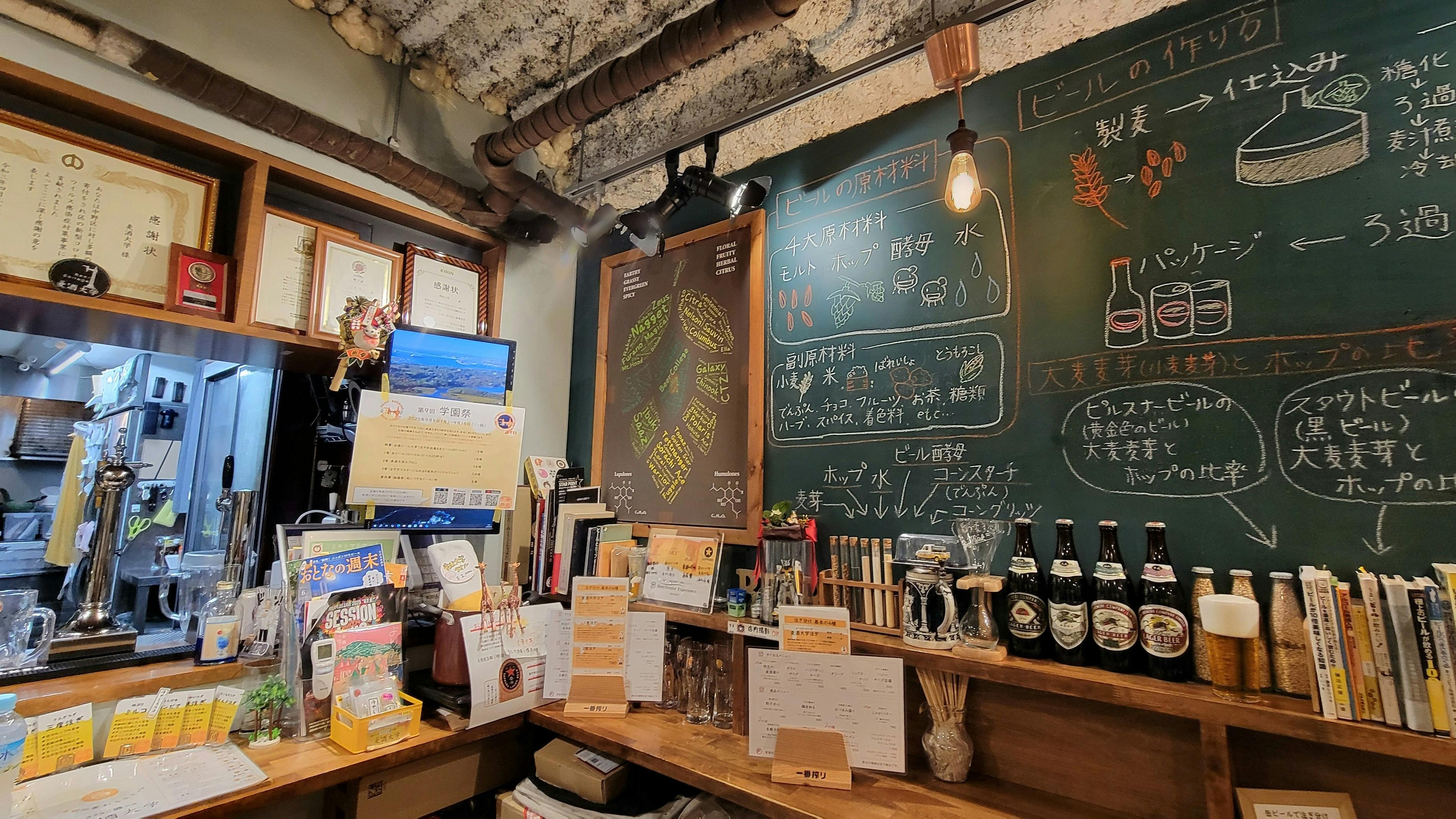 文字通り「人生観を変える」ビールが楽しめる麦酒大学は、コンセプト通り大学をイメージした内装の2階と、学長のコレクションがずらりと並ぶ3階に分かれています。