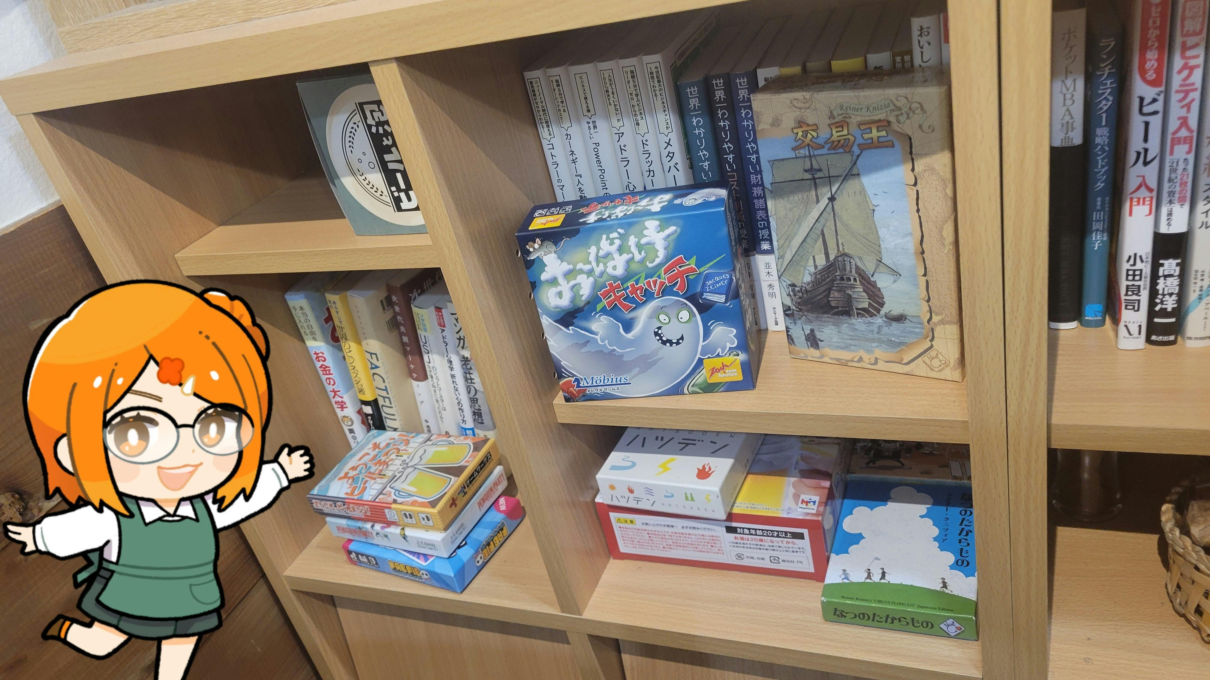 3階のコレクション棚は、ビールグラスや書籍がメインですが、さらっとボードゲームも置いてあるのです!