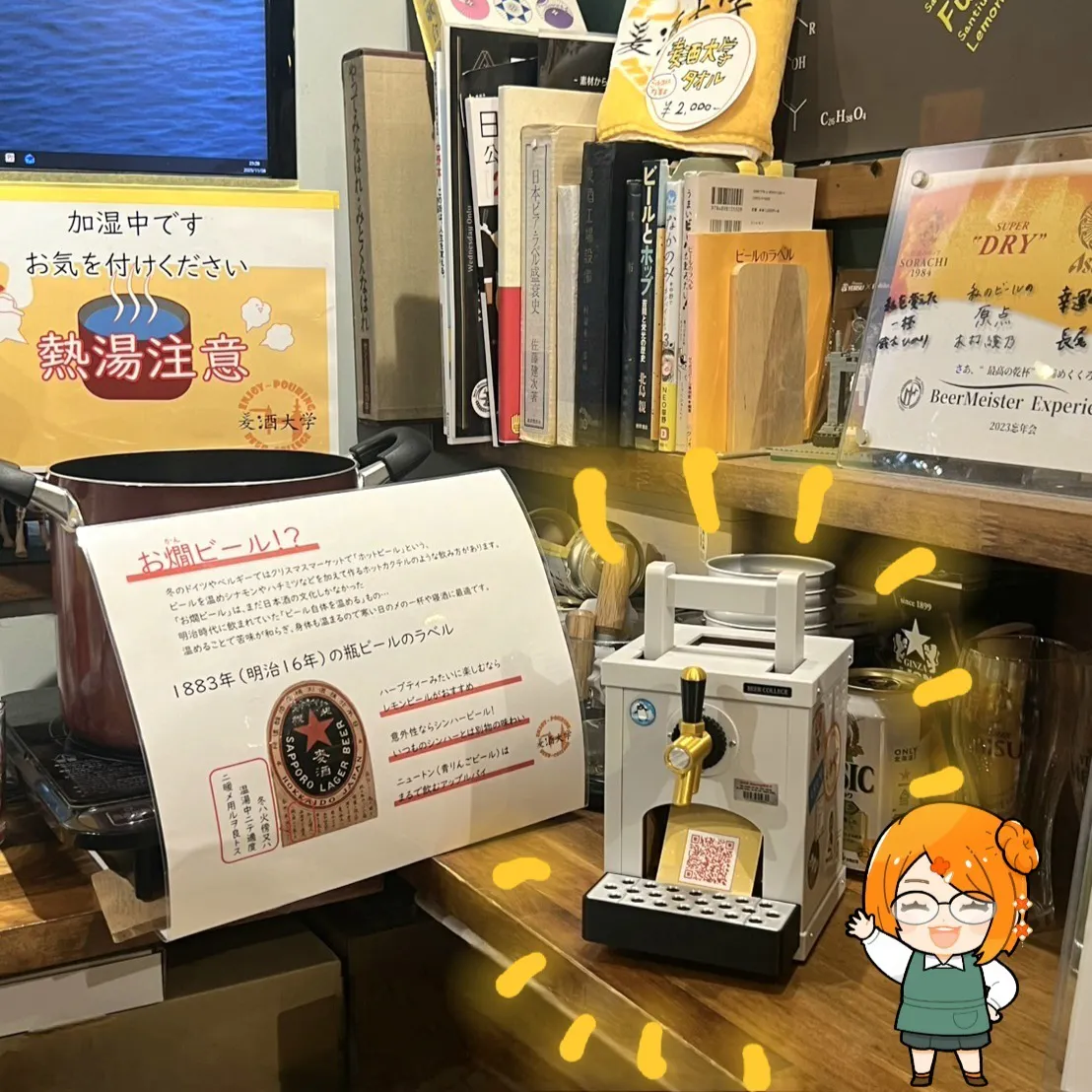 講義を受けるカウンターの右手、燗ビール温めコーナーのすぐ横におりますので、麦酒大学に行ったら是非見たり触ってみてくださいね!↓