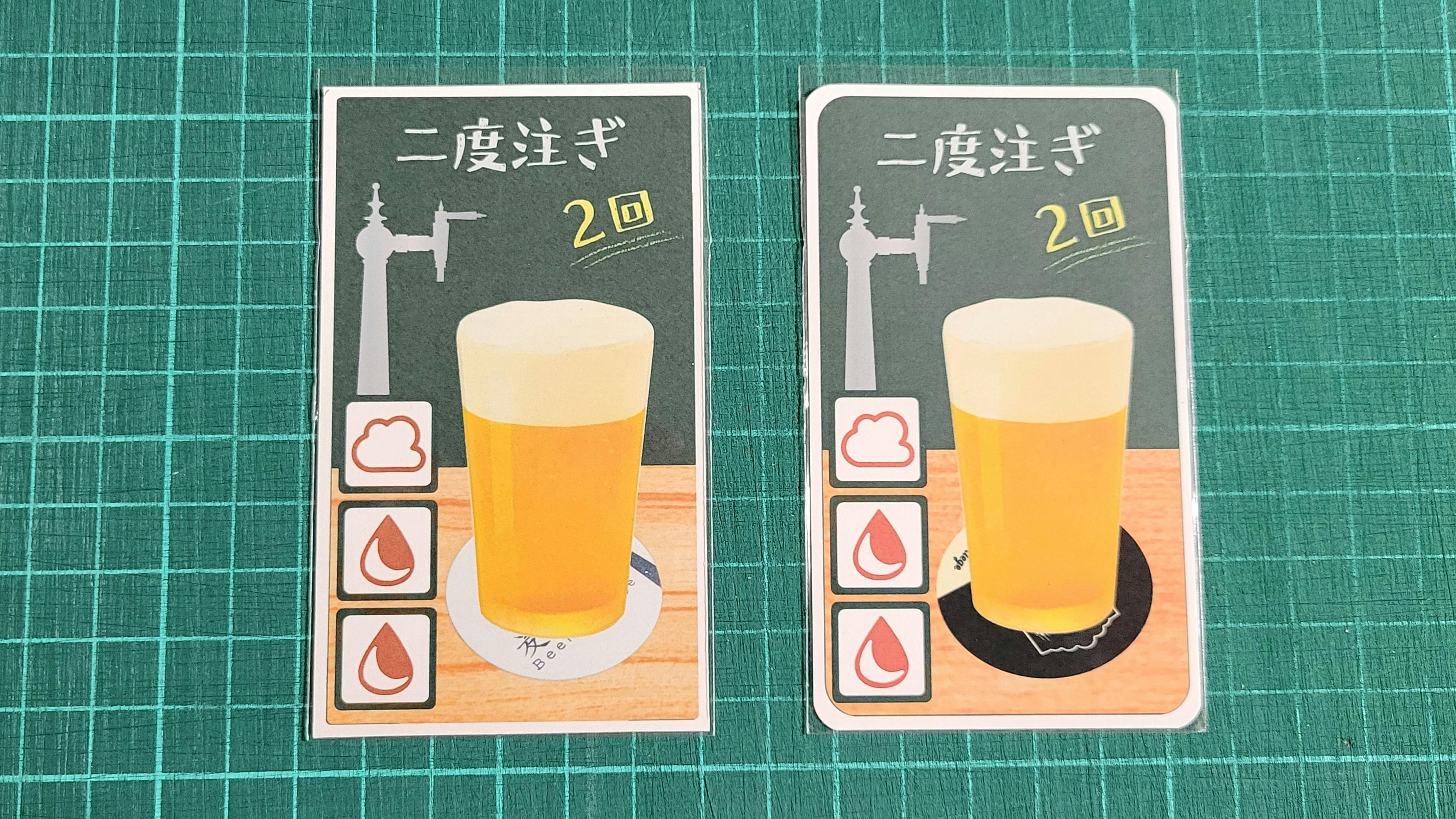2026/02/11 17:00皆様おつかれさまちか!昨日が楽しすぎて起きたら昼だったプロジェクトリーダーの とものまちか です。レポートは明日以降に投稿するので、まずは昨日の活動報告の答え合わせです!まだ昨日の投稿を見ていない方でも、なんとなく分かるよう綴っていきます。まずは、サムネイル画像にもしたビールカード。どのカードも修正箇所は同じなので、代表として二度注ぎさんでご紹介です。修正5か所は……こちら!上から順に①角の丸みの変更(前回は自宅の角丸と角度があわなくてそのままでした)②テキスト位置を少し下にして余白を確保③ダイスイラストのカラー調整④コースターを変更⑤テーブルの素材を変更でした!①の角についてはカードをシャッフルする役割は私しかやっていないので誰も痛い思いはしていないはずですが、改めて角丸の必要性を感じました。製品版はもちろん角丸します!デザインにカーブが沿ってないの気になるぅ……これも調整しなくてはですね。②はスイングカラン(サーバー)のイラストとぶつかるのを気にして上に配置しましたが、窮屈に見えて調整。ほどよい余白、大事!③は次に紹介するダイスの色に合わせる形に。写真だとここが一番分かりづらかったと思います。ダイスの刻印の色が去年秋までは赤寄りだったのを、オレンジ~茶色の間あたりで再調整をかけています。豪華版のダイスは背景がビール色≒黄色なので、近すぎずバランスのいい塩梅を探し中です!④は一番分かりやすかったかな?今までは麦酒大学で実際に使われているコースターを撮影して使っていました。製品版では『ビールダイスキ!』の世界観にあわせ、校章と学校らしいカラーでまとめたデザインになっています。いつか実物がお披露目できる……かも……?!⑤は商用利用可素材を使っていたのですが木目が気になったので、自宅で撮影して調整しました。学校の机、だけでいうともっと木目が目立っていいのでしょうけど、メインのイラストやゲームの情報とぶつかるのが気になってしまい……。ここも再調整をかけると思います。マチカンニが一晩で作成した割には、いい修正になったと思います!続いてダイス。こちらは↑で書いたとおりオレンジ寄りに調整をかけたので、新しいほうは左でした!昨日は耐水性を重視した結果ベタつくシールだったので、ダイスタワーに引っかかってしまって申し訳なかったです。製品版では流石に問題ないはず!!最後は注ぎ手カード。全体のデザインも練り途中ですが、方向性を変えない範囲で修正を、ということで6箇所いじりました。こちらは代表として体験会でも大活躍だった重富さんのカードでご説明。ビールカードの答えを見た後なら楽勝ですね!①角の丸みの変更②注ぎ手イラストを大きく③カード名の文字とデザインを大きく④テキストの枠の位置調整⑤テキスト修正(ダイスアイコンの色調整)⑥背景色をより濃いめにでした!素面モードで使う注ぎ手カードは、第1回の体験会直前に効果を注ぎ手にあわせたものに大幅変更していました。第1回開催から昨日の第2回体験会の間で、遊んでくださった皆様の反応や私の感じたことを反映してブラッシュアップして今に至ります。修正後は各段に見やすくなったし、映えるようになったのではないでしょうか!このままでも充分素敵ですが、もう少し改良の余地があると感じています。体験会でいただいたご意見と、ゲームに登場していただけるレジェンドな注ぎ手の方々への敬意を糧に、最後の調整をかけていきます!引き続き、ビール片手にお付き合いくださいませ★ もっと見る