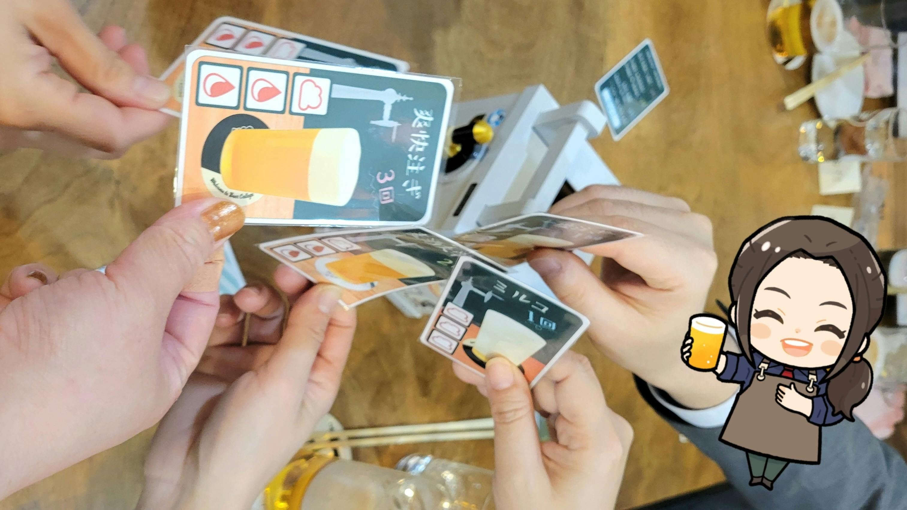 2026/02/13 18:30皆様おつかれさまちか!プロジェクトリーダーの とものまちか です。いつの間にかプロジェクト終了まであと2週間となりました。毎日ビール漬けだった(?)日々が終わってしまうと思うと、少し寂しいです。……まぁ、まだまだやることは盛りだくさんですし、本件に関係なくビール飲みますけどね★さてさて、本日は体験会レポート後半の部を綴ります。前半の部はこちら入店時から普段のペースで飲んでいるし楽しく遊んでいるしですっかり仕上がっているなか、後半の部の方々をお迎えしました。後半の部は8名。自己紹介もしつつ1杯目が揃ったので、ソーシャルディスタンス乾杯!(うすはりグラスだからね!!)『酔っぱらいモード』の準備をしていたら、なんと清水店長が遊びに来てくださいました♪トイレに行っていたら歓声が聞こえてなにかと思いました。なんてタイミングで離席してしまったんだ…!!前半の部で遊んだ方はみんなが遊んでいる姿を肴に飲むとのことで(お気遣いありがとうございます)、計7人でプレイしました。テストプレイのときから成功率が高めだった清水店長。運気をあげるフィールド効果でもあるかと錯覚するくらい、皆様あっさり成功してました!難易度の高い一度注ぎやミルコもサクサク注がれていきます…!どのビールも1人しかチャレンジしないままビールカードが半分なくなったのは流石に初めてです!!本当に清水店長の効果なんじゃなかろうか。これはあっさり全員で乾杯か~?なんて話していましたが、しっかりオチが回収されていきました。そう。ダイスゲームなんてそんなもんです。お冷での乾杯をネタにすることで、飲酒中に水分摂取をしっかり行う風潮にならないかな?人数多いから時間がかかるか心配しましたが10分ほどであっさり終わり、そのまま素面モードへ。素面モードで追加されるビールカードにはオールマイティを要求するものがあるのですが、ちょうどいいところに清水先生がいらっしゃる!同卓している時間のあいだに活躍してもらえて、なんだか嬉しかったです♪普段は私も遊んでいるので撮り忘れがちですが、今回は少し引きでの撮影もしました!素面モードでは先生/先輩に教わる『注ぎ手カード』を4枚公開するので、酔っぱらいモードより場所をとります。麦酒大学のスタッフの方が撮ってくださった写真も載せちゃいます!ちょうど写真左手前の方がチャレンジを行うところですね。「ビール大好き~♪」と叫ぶ効果のないカードが出たあとだったので、皆様のビール(とビールダイスキ!)への愛が溢れている幸せ空間でした!素面モード6人戦は途中でビールを頼んだり飲んだりしたので30分くらいでした。こちらは勝敗を見るために獲得したカードを見せてもらっている図。清水店長が去ったあとも幸運続きだったので大接戦でした!最後にゲームシステムの細かい調整や、デザインのご意見をいただいてお開きとなりました。固定カメラがあれば録画しておきたかった…!!自身が作った作品を楽しそうに遊んでいただき、さらに調整をかけたところにご意見をいただいたり褒めていただいたりして、非常に有意義な会でした♪第1回に続き、皆様ご満足いただけたようでなによりでした!残り2週間、今のところ体験会や外で遊んでいただく予定はありませんが、引き続き魅力をお伝えしていこうと思います!! もっと見る
