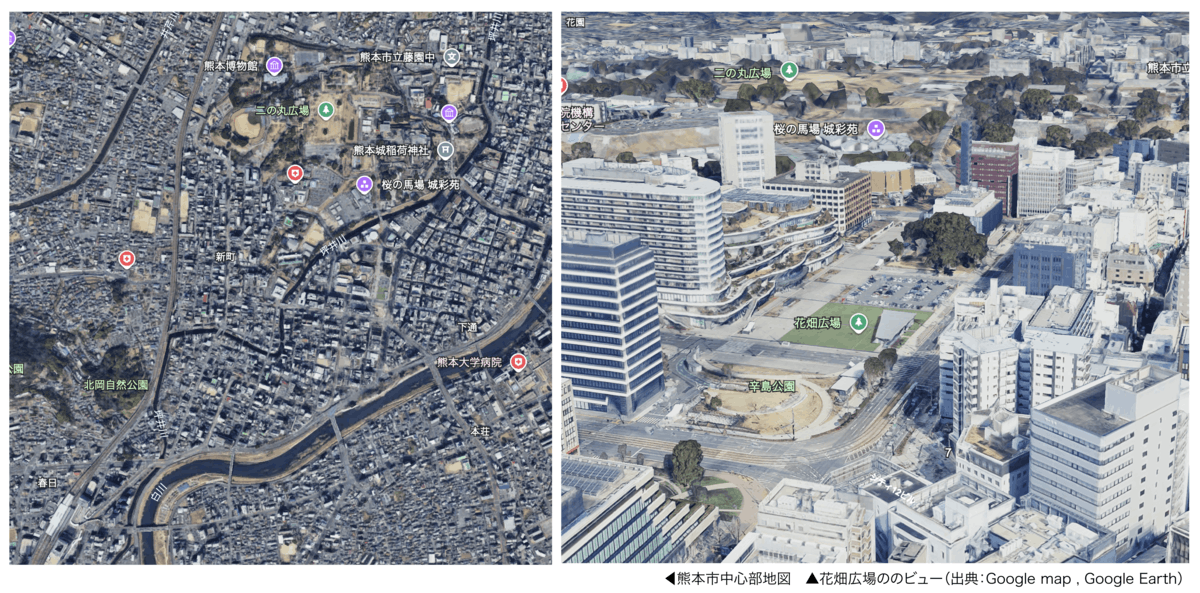 熊本市は「歩いて楽しい、居心地のいいまちなか」を目指し、ウォーカブル推進都市として、熊本駅〜花畑広場〜熊本城を中心に広場や道路空間の再構成を進めています。その象徴が、熊本城と市街地をつなぐ「花畑広場」です。