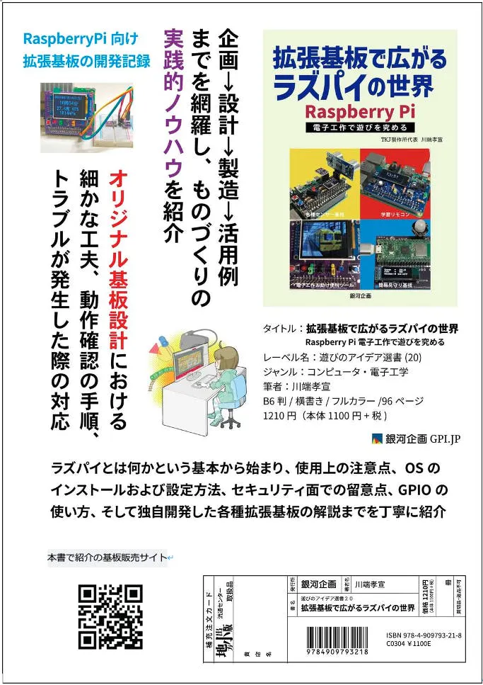ラズパイ本「拡張基板で広がるラズパイの世界」を出版しました。書名かISBN「9784909793218」で検索すると出てくると思います。初心者と拡張基板(HAT)を作ってみたい中級者までが対象の冊子です。