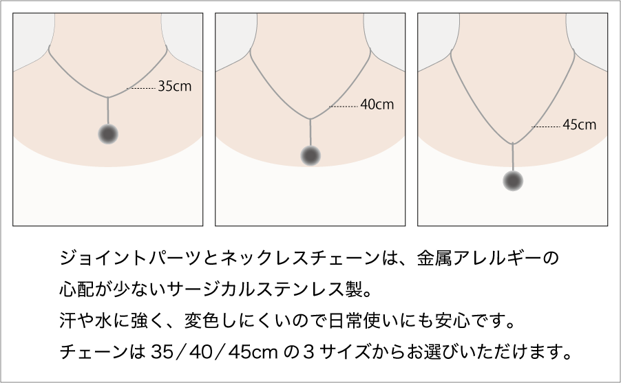 アレルギーに配慮したサージカルステンレス素材を使用。水や汗にも強く、長く美しさを保ちます。