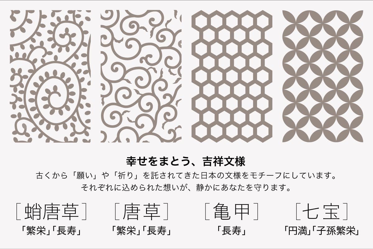 吉祥文様:唐草 四方八方に伸びる蔓草は強い生命力の象徴で、「繁栄」「長寿」を意味しています。