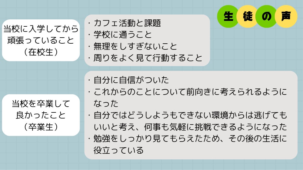 当スクールに通う生徒は、様々な事情や背景から学校生活にうまく馴染めず、不安感や心の不調を抱えて不登校に悩みながらも、何とか乗り越えようと日々ここに通っています。