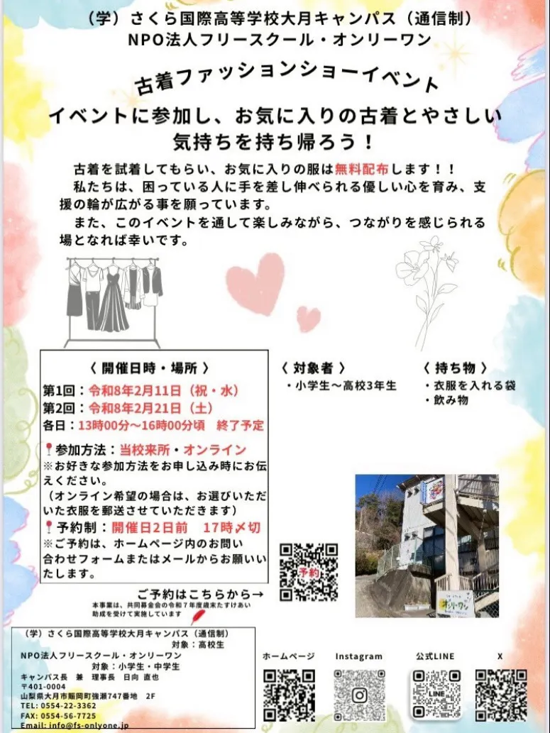 2026/01/30 20:31当校にご支援いただいている皆様、いつもありがとうございます。今回は、2月に開催する古着ファッションショーの紹介をしていきます。このイベントでは、事前に大学生や保護者の方から回収・購入した衣類から自由に選んでコーデを組むことができます。その後試着などしてもらい、気に入ったお洋服はお持ち帰りいただけます。いつもと違う系統の服を気軽に着てみる機会にもなります。ショッピング気分でお気軽にお越しください。≪日時≫ 2/11(祝・水)、2/21(土) 両日13:00-16:00≪参加費≫ 無料≪参加方法≫ 当校来所・オンライン≪申込方法≫ チラシのQRコードよりお願いいたしますたくさんの方が来てくださるのをお待ちしております。次回は、子どもたちの様子をお届けします。【現時点での支援総額】681,000円【残り日数】8日 もっと見る