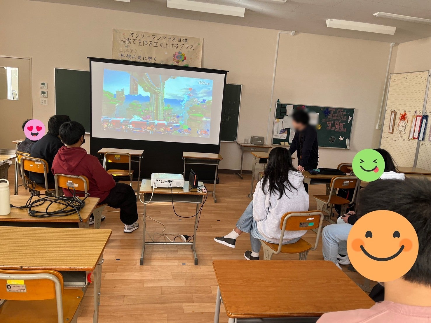 今回も皆でゲームをしたのですが、いつもとは違って大きなスクリーンに画面を映してプレイしたので非日常感にワクワクしていました。マルチプレイも個人戦も行い、ゲームを通じて子どもたちの仲もかなり深まったのではないかと思います。また、当校にまだ慣れていない子を遊びに積極的に誘ったり、通信トラブルが起こると率先して対応したりするなど、皆の成長がたくさん見られました。